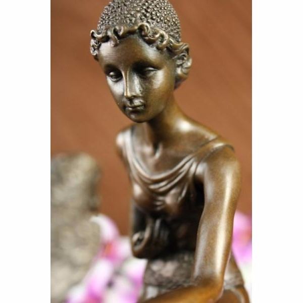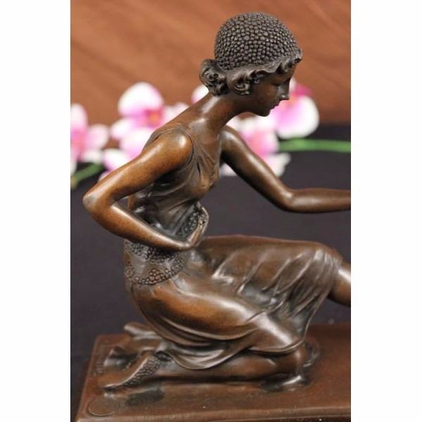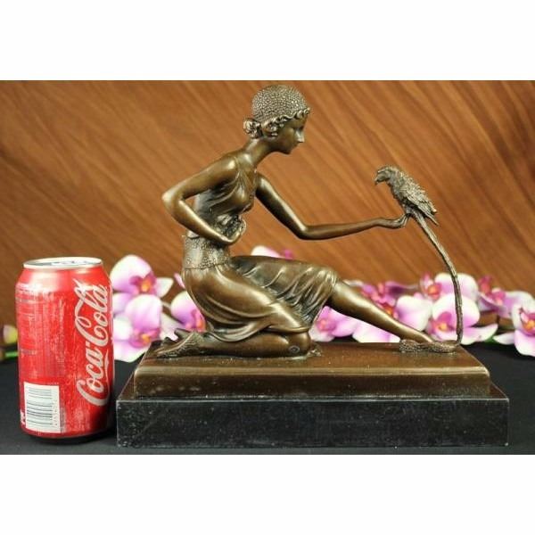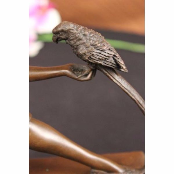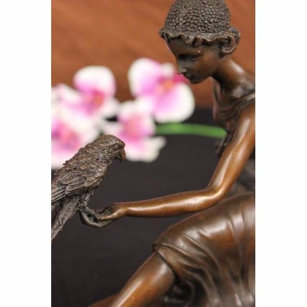 She is a elegant bird whisperer. A well-dressed young woman on her way to a ritzy night out, steals a moment to play with a exotic parrot. She kneels down in her evening dress and holds a welcoming hand out. The friendly parrot lands on her fingertips and searches her palm for seeds. She hides fruits in her other hand and cradles it to her chest. She is finely dressed in a long dress with a beaded belt and matching studded hat. 100% bronze and handmade, this brown patina sculpture was cast using the "Lost Wax Method" and mounted on a black marble base and is signed Chiaparus. Condition : This sculpture is in perfect condition. Bronze Dimensions with Marble Base:Height 10" x Width 10" Marble Dimensions: 10" X 4". Height without base: 9" Weight : 12 LBS Inventory : 27Ds1483872