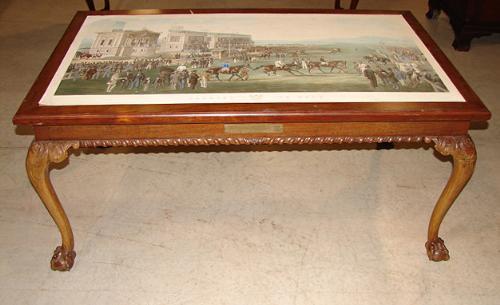 CHIPPENDALE STYLE WALNUT COFFEE TABLE. Decorated with German horse race scene at top title “Courses de Dabe”. Ball and claw feet. Brass tag at apron reads “Ehrenpreis Der Stadt Baden-Baden/Gegeben Von Der Bader Und Kurverwaltung/Baden-Baden”. 22.25” H, 47.5” L, 28.5” W