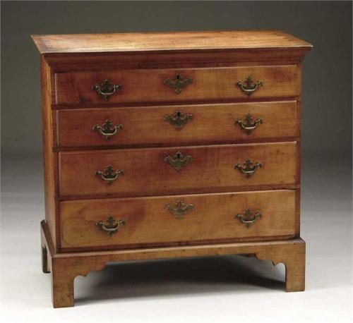CHIPPENDALE FOUR DRAWER GRADUATED CHEST. Curly and figured maple having four graduated drawer with cornice molded top raised on original molded bracket feet. Fourth quarter of the 18th C. SIZE: 37” h x case 36” w x 18-3/4” d. CONDITION: Very good. 9-26646
