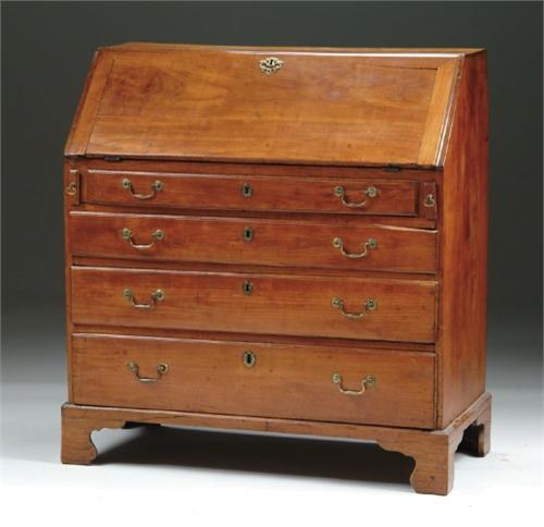 CHIPPENDALE FOUR DRAWER SLANT FRONT DESK. Cherry wood case with walnut applied bracket base. Graduated drawers having original bale hardware and bead molded edges. The interior having six drawers with inlaid edges, a central door having oak and acorn inlaid oval. SIZE: 39in. h x 36in. w x 18in. d. CONDITION: Second drawer has slice off top molding, slight warp to lid and stains to top. Generally good. 9-26034