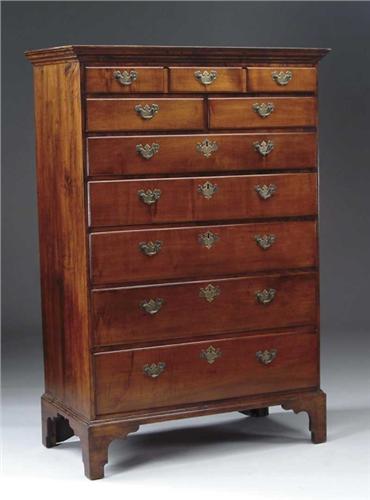 CHIPPENDALE GENTLEMAN’S TALLBOY. Maple and curly maple tallboy having one long drawer simulated as three over two short drawers. Five graduated drawers beneath. All raised on original molded and carved bracket feet. SIZE: 57-1/2” h x 18-1/2” d x 36” w. CONDITION: Replaced brasses, very good. 9-26642