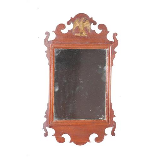 CHIPPENDALE MAHOGANY MIRROR - MAHOGANY MIRROR W/ PIERCED CARVED GILT PHOENIX CREST, CARVED EARS & OLD THICK PLATE GLASS MIRROR (21 3/4" T X 12 1/4" W) - WEAR, REPAIRS, IMPERFECTIONS