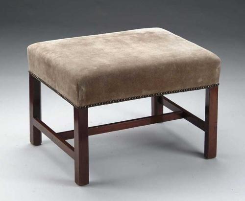 CHIPPENDALE MAHOGANY UPHOLSTERED OTTOMAN. Square legs have chamfered inside corner, dovetailed stretcher and over upholstered top. Reupholstered in a crushed light olive fabric with brass tack edge. SIZE: 17” h x 24” l x 20” w. CONDITION: Very good. 9-27976