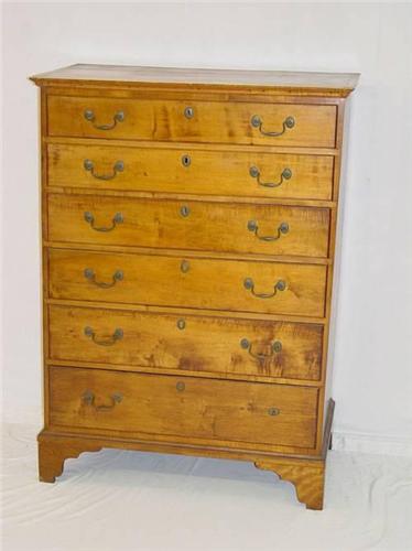 CHIPPENDALE MAPLE GRADUATED 6 DRAWER TALL CHEST W/ BRACKET BASE & BAIL BRASSES - REFINISHED, IMPERFECTIONS;