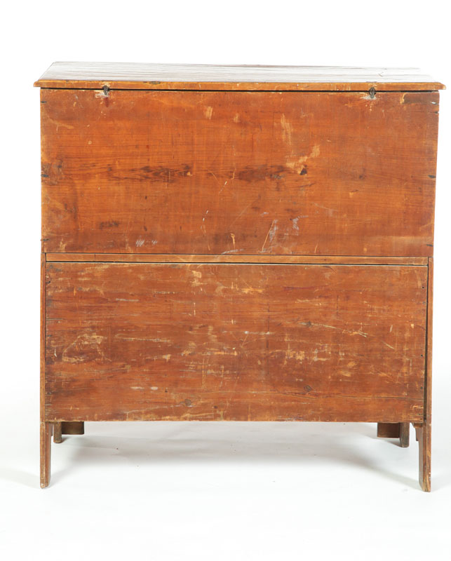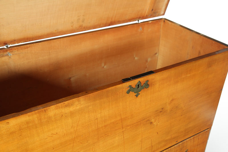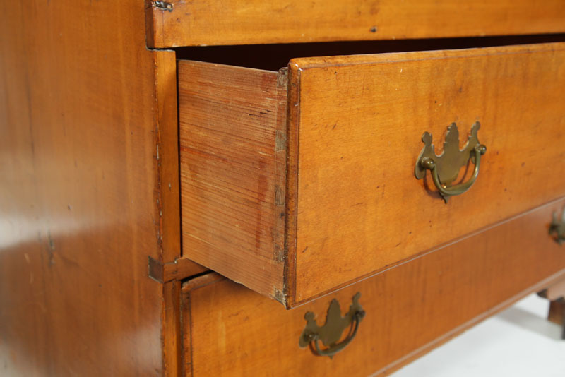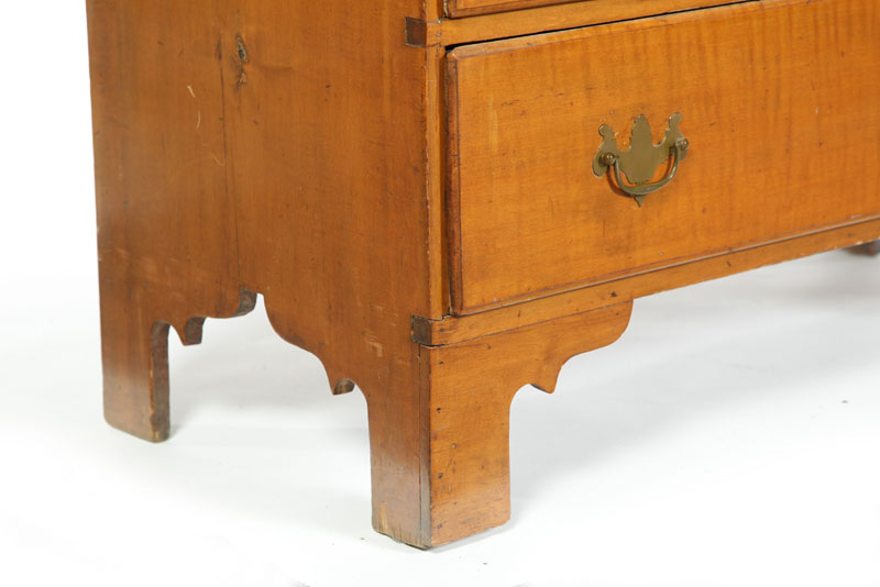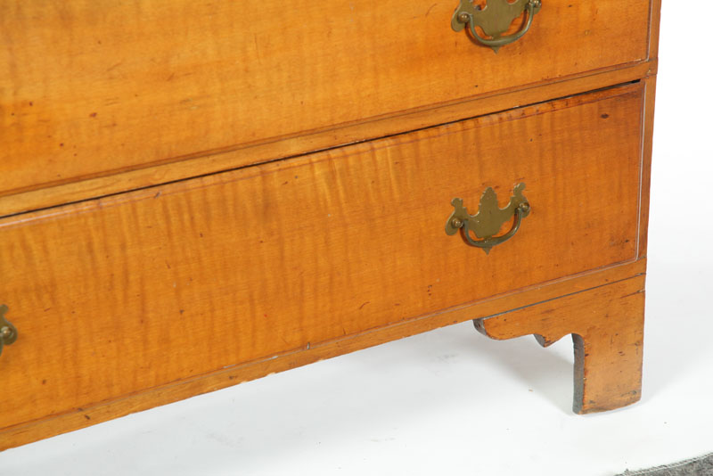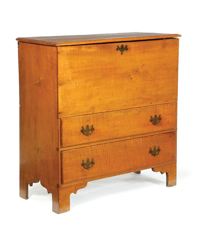 New England, late 18th-early 19th century, curly maple. Two dovetailed drawers and cutout bracket feet. Refinished. 39"h. 37"w. 17"d.