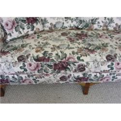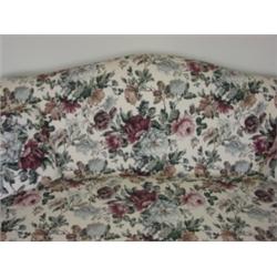 CHIPPENDALE STYLE CAMEL BACK SOFA. Labeled underneath center cushion Huntington House. Floral decorated upholstery. Good overall condition. 35" H, 67.5" W