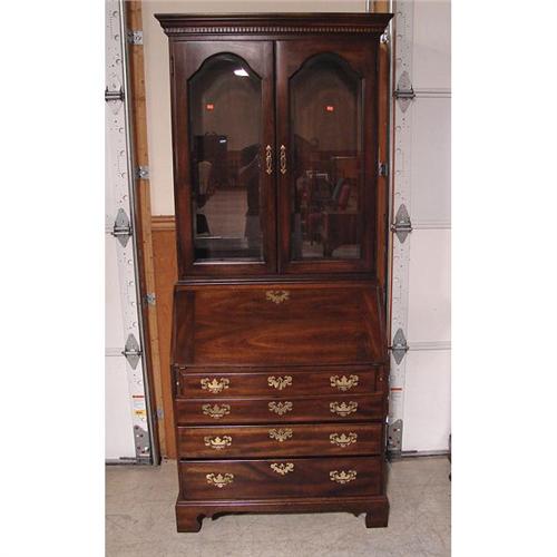 CHERRY CHIPPENDALE STYLE TWO PIECE SECRETARY. Has two beveled glass tombstone doors at top with two glass shelves over slant-lid desk with fitted interior and dovetailed drawers and brass bat-wing pulls. Dentil molding at top cornice. Top section is lighted. 82.5” H, 34” W, 19” D