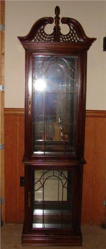 CHIPPENDALE STYLE LIGHTED CURIO CABINET. Broken arch top with finial. Quarter columns at sides. Glass door and top and glass door at bottom. 85.5” H, 22.5” W, 13” D