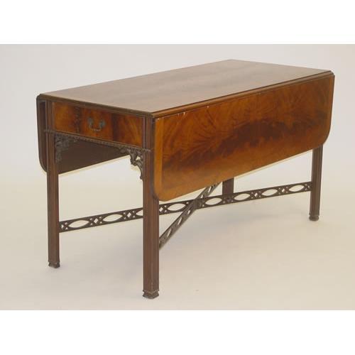 CHIPPENDALE STYLE DROPLEAF TABLE - MAHOGANY W/ MOLDED LEGS, PIERCED CARVED SPANDRELS & STRETCHERS, CROTCH VENEERS & FANCY BRASS HARDWARE (29 1/2" T X 54" L X 24 1/2" W) - WEAR, SMALL LOSSES, IMPERFECTIONS