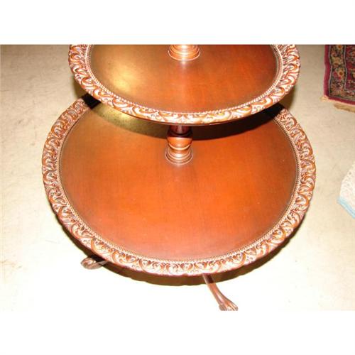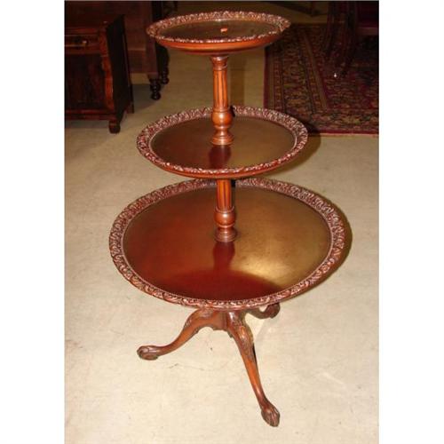 MAHOGANY CHIPPENDALE STYLE MAHOGANY DUMBWAITER. Has three shelves with heavy carvings around edges of shelves on rat claw & ball feet. 44.5” H, 26” Dia.