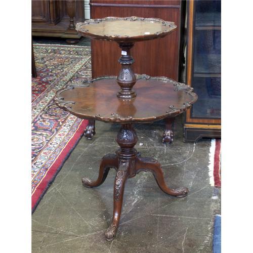 DUMBWAITER; Chippendale style mahogany two tier dumbwaiter, tiers, column and legs carved with acanthus leaves and scrollwork. 34''h x 25''diameter