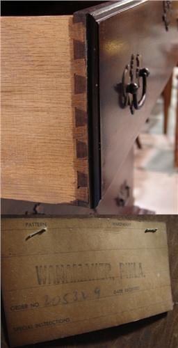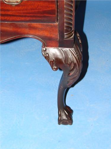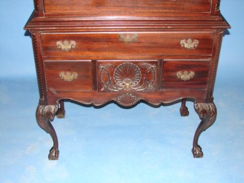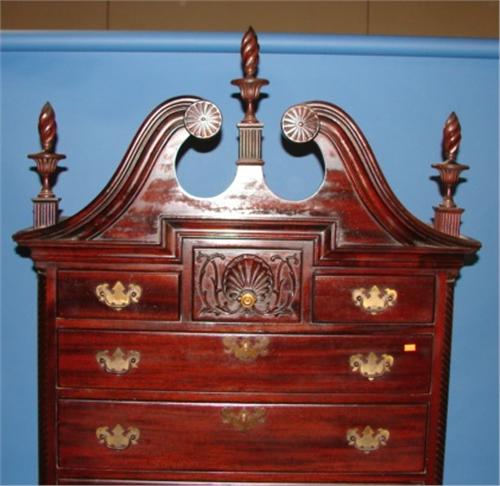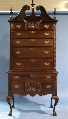 ORNATE CHIPPENDALE STYLE MAHOGANY HIGHBOY. Rope columns at sides. Cabriole legs with ball & claw feet. Has three flamed urn finials at top. Broken arch top. Shell carvings at center drawer fronts. Shell carving at middle of bottom apron. Three drawers over four graduated drawers at top over single drawer over three drawers at bottom. Drawers are dovetailed. Marked with label on reverse “Wanamaker, Phila.” 88” H, 37.5” W, 20” D