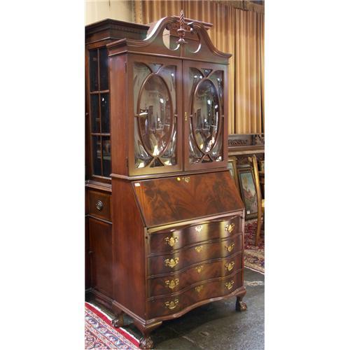 SECRETAIRE/BOOKCASE: Chippendale style mahogany secretaire/bookcase, uppper part with molded broken pediment, bubble glass doors, lower part with serpentine front slant top desk, fitted interior, ball and claw feet. 81''h x 16''d x 34''w