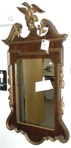 CHIPPENDALE STYLE MIRROR parcel gilt with pheonix, 55" high, 29" wide. condition: the missing piece of scroll is present in the attached envelope. otherwise excellent.