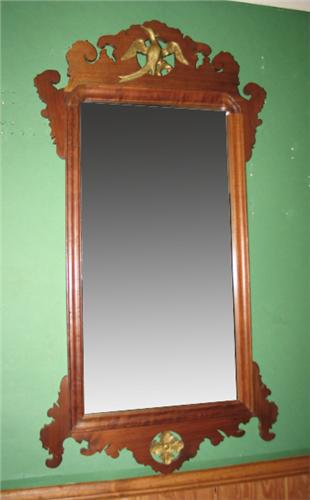 CHIPPENDALE STYLE CABINETMAKER WALL MIRROR. Gilt phoenix carved decoration at top. Marked on reverse “Harvey Shockley, Jr., 1972”. 23.5” x 44”