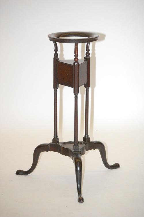CHIPPENDALE STYLE WASH BASIN STAND - FANCY TRIANGULAR MAHOGANY STAND W/ ROUND BASIN HOOP, 2 TRIANGULAR DRAWERS, TURNED UPRIGHTS ON A TRIANGULAR BASE & 3 CABRIOLE LEGS W/ SHOE FEET (30 1/4" T X 23" TOE TO TOE) - WEAR, REPAIRS, IMPERFECTIONS