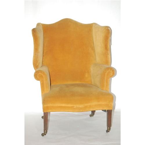 CHIPPENDALE STYLE WING CHAIR - CUSTOM CHIPPENDALE STYLE WING CHAIR W/ SQUARE MAHOGANY LEGS & SHAPED SEAT IN GOLD VELVET UPHOLSTERY (44 1/2" T X 33" W X 33" D) - WEAR, SOILING, IMPERFECTIONS