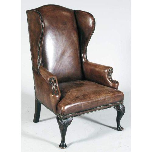 CHIPPENDALE STYLE WINGBACK CHAIR with leather brass studded leather upholstery, circa 1900, CONDITION REPORT: normal wear to leather from use, mostly on seat.