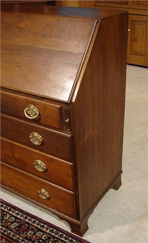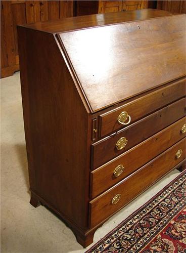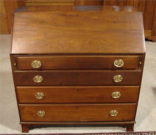 CHIPPENDALE WALNUT SLANT-FRONT DESK. Fitted interior. Four graduated dovetailed drawers. Drawers show signs of restoration. New pulls. Replaced bracket feet. 42” H, 41” W, 19” D