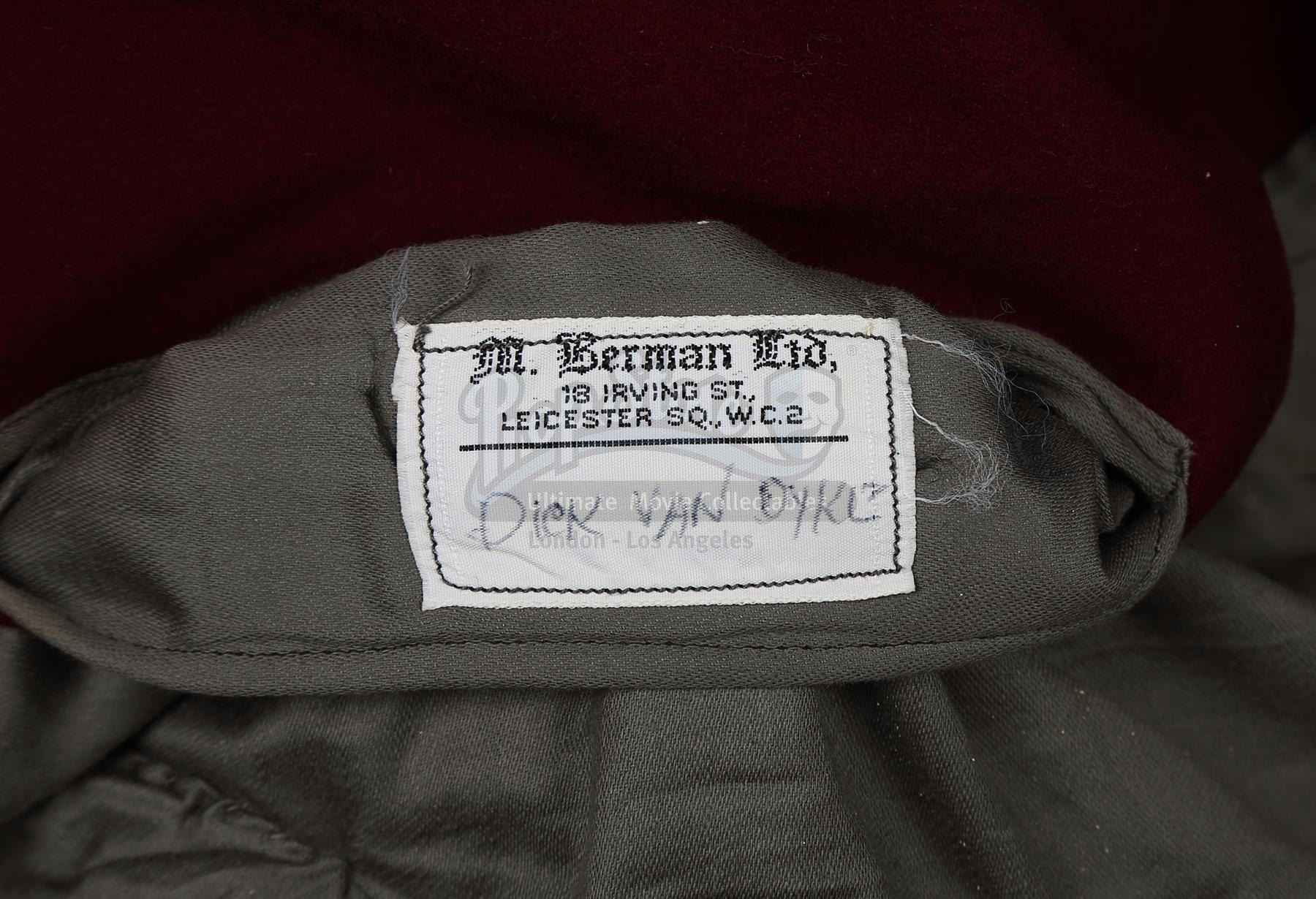 Made of grey wool, the jacket displays burgundy felt material on the lapels and cuffs, with matching burgundy accents on the hip pockets. Lined with grey cotton, the jacket features two M. Berman Ltd. labels, including a handwritten label located inside the interior pocket, reading 'Dick Van Dyke' in black ink. Displaying light signs of wear as a result of age and use, there is slight discolouration to the lining of jacket and a small mark on the front. However, it remains in very good overall condition.