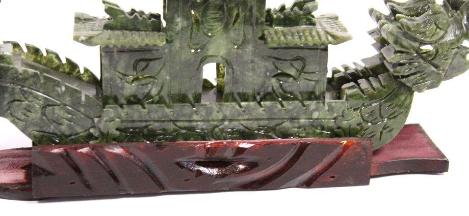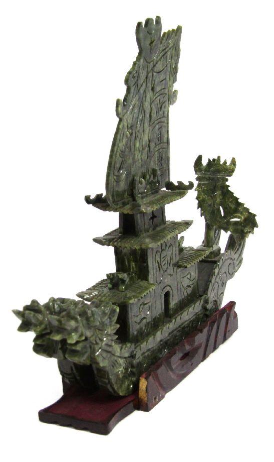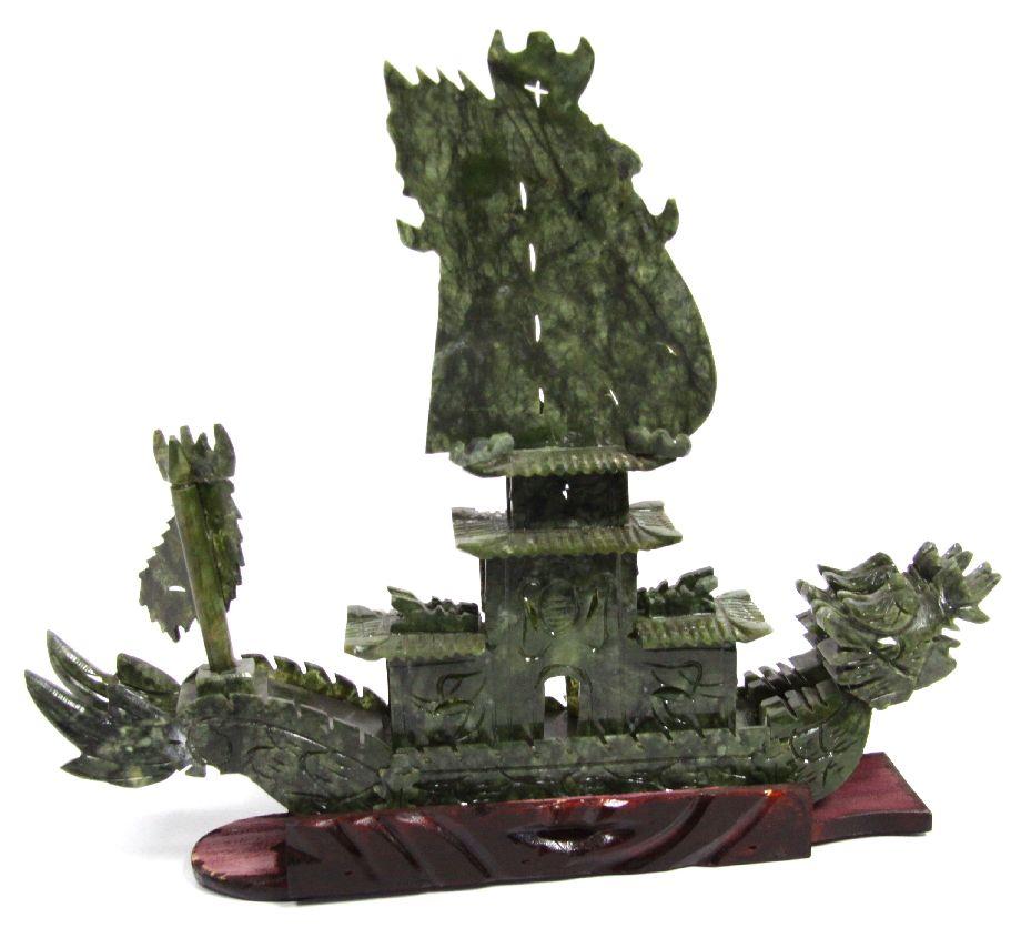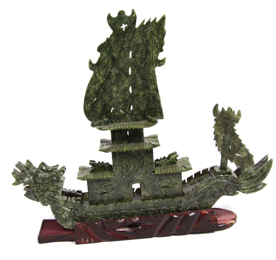 20th C. 14.75x3.5x13 inches. Carved Chinese green hardstone ship with dragon head bow and large sail on decorative wooden base. Overall very good condition with some repairs and loose sails .