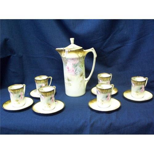 This is a truly outstanding set including a chocolate pot with six cups and saucers. Decorations on these pieces are pink and white roses and a small blue flower(not identified) highlighted with gold trim and a flower within the trim. There is also a rose inside each cup. The pieces of this set are clearly marked "RS Germany".(green mark) Condition of these pieces is excellent.