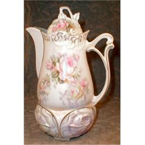 This antique chocolate pot is molded in, the RS Prussia style, with roses