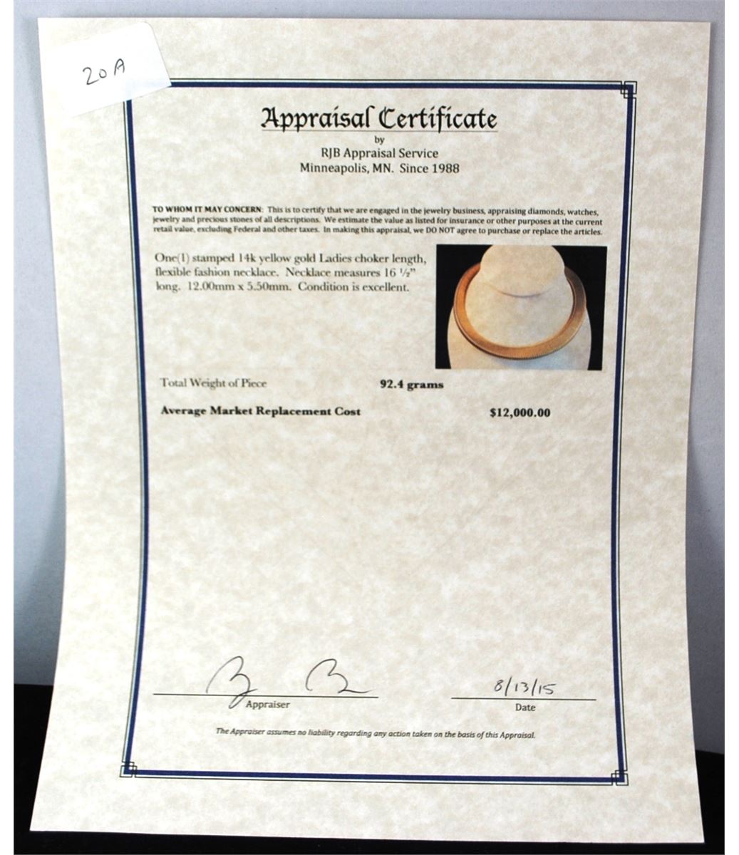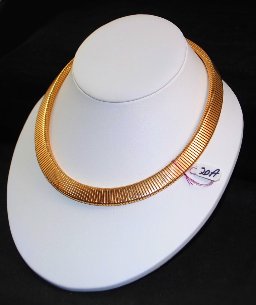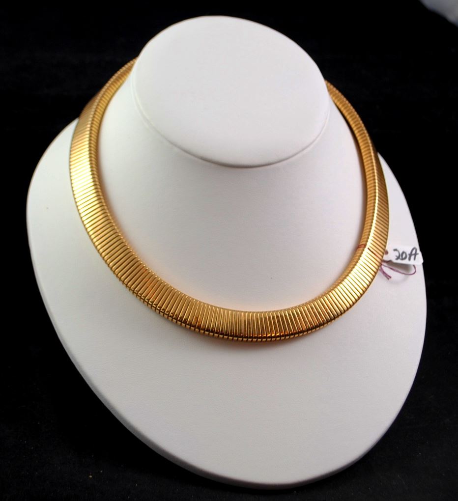 ONE STAMPED 14K YELLOW GOLD LADIES CHOKER LENGHT, FLEXIBLE FASHION NECKLACE. NECKLACE MEASURES 16 1/2" IN LENGTH. 12.00MM X 5.5MM. CONDITION IS EXCELLENT. TOTAL WEIGHT IS 92.4 GRAMS. THE AVERAGE MARKET REPLACEMENT COST IS