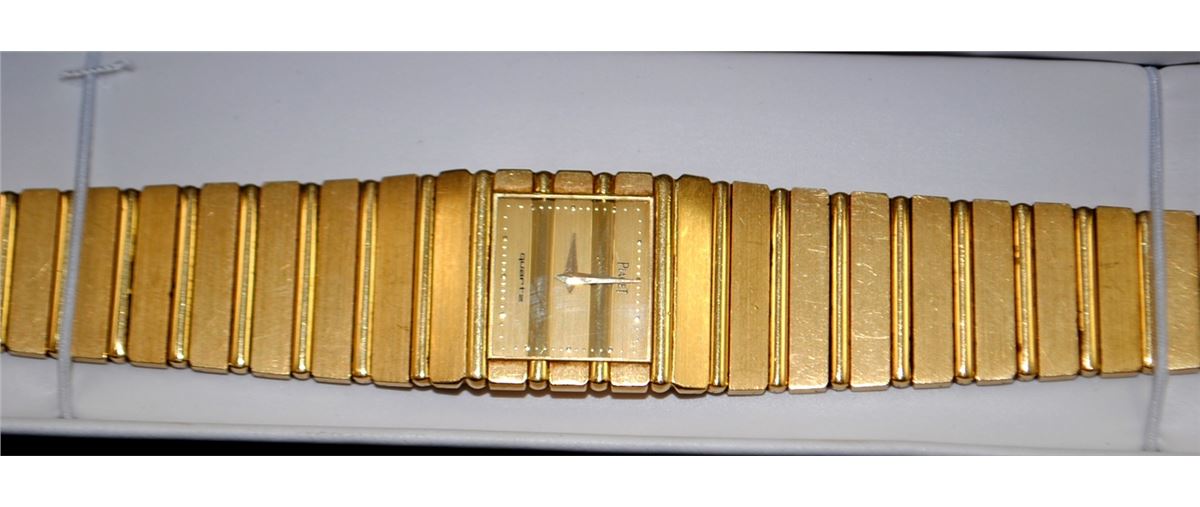 CHOICE MENS "PIAGET" 18K YELLOW GOLD WRISTWATCH WITH GRADUATED BNAD, BRUSHED GOLD PATTERN. QUARTZ MOVEMENT. FLUSH DESIGN WITH CROWN ON BACK OF CASE. BACK OF CASE READS "7131 C701"...362029. VAROIUS MINOR