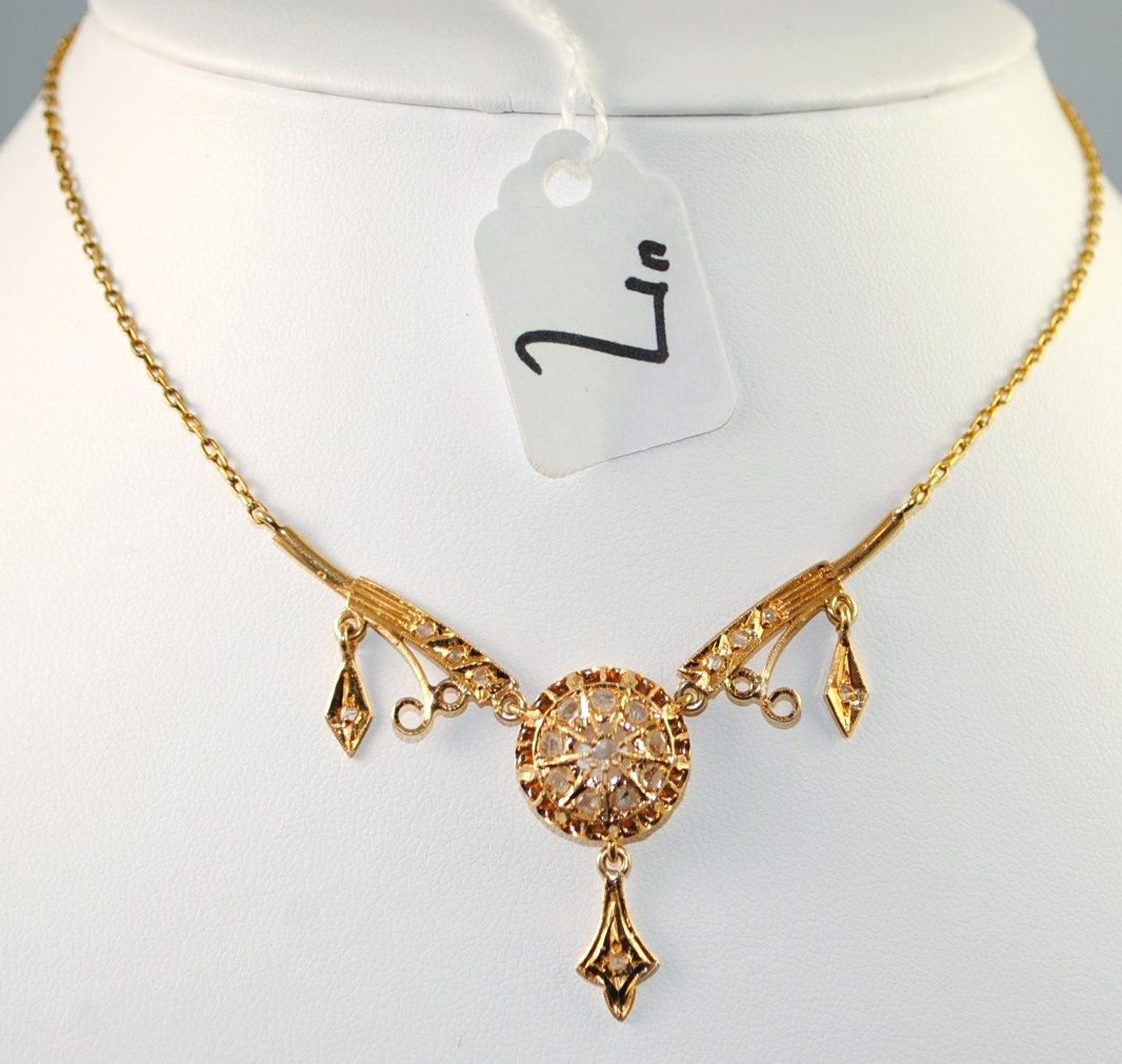 CHOICE VINTAGE 18K YELLOW GOLD "ROSE CUT" DIAMOND NECKLACE WITH 19 HAND SET "ROSE CUT" DIAMONDS - WEIGHS 7.0 GRAMS - APPRAISED RETAIL REPLACEMENT IS $5,000.00 - COMES WITH THE JEWELERS APPRAISAL CARD! "OUTSTANDING
