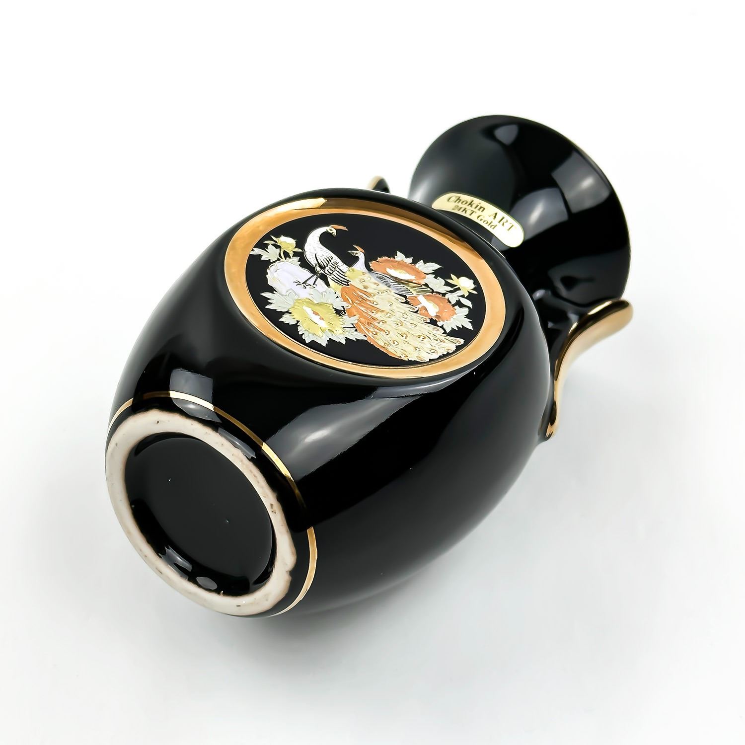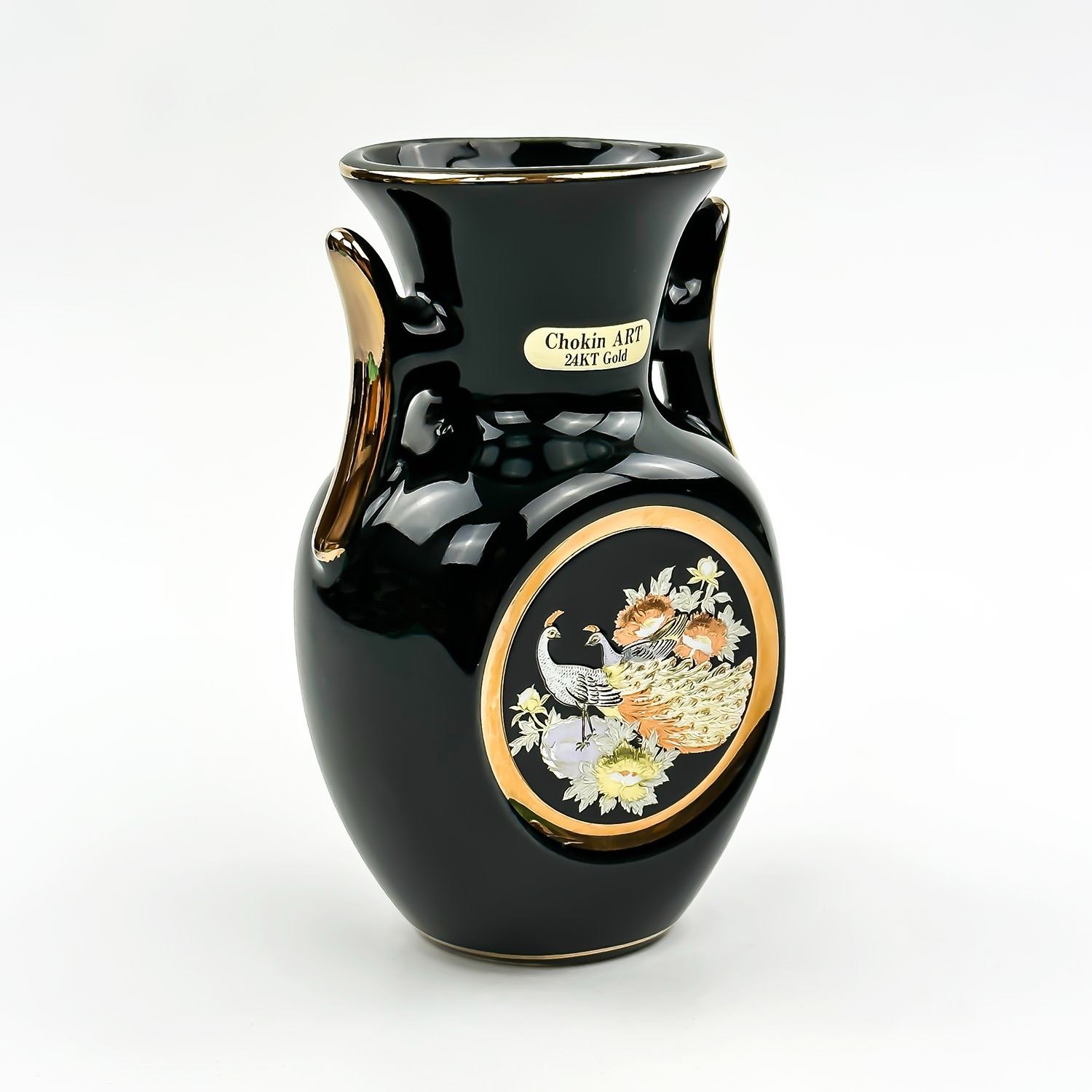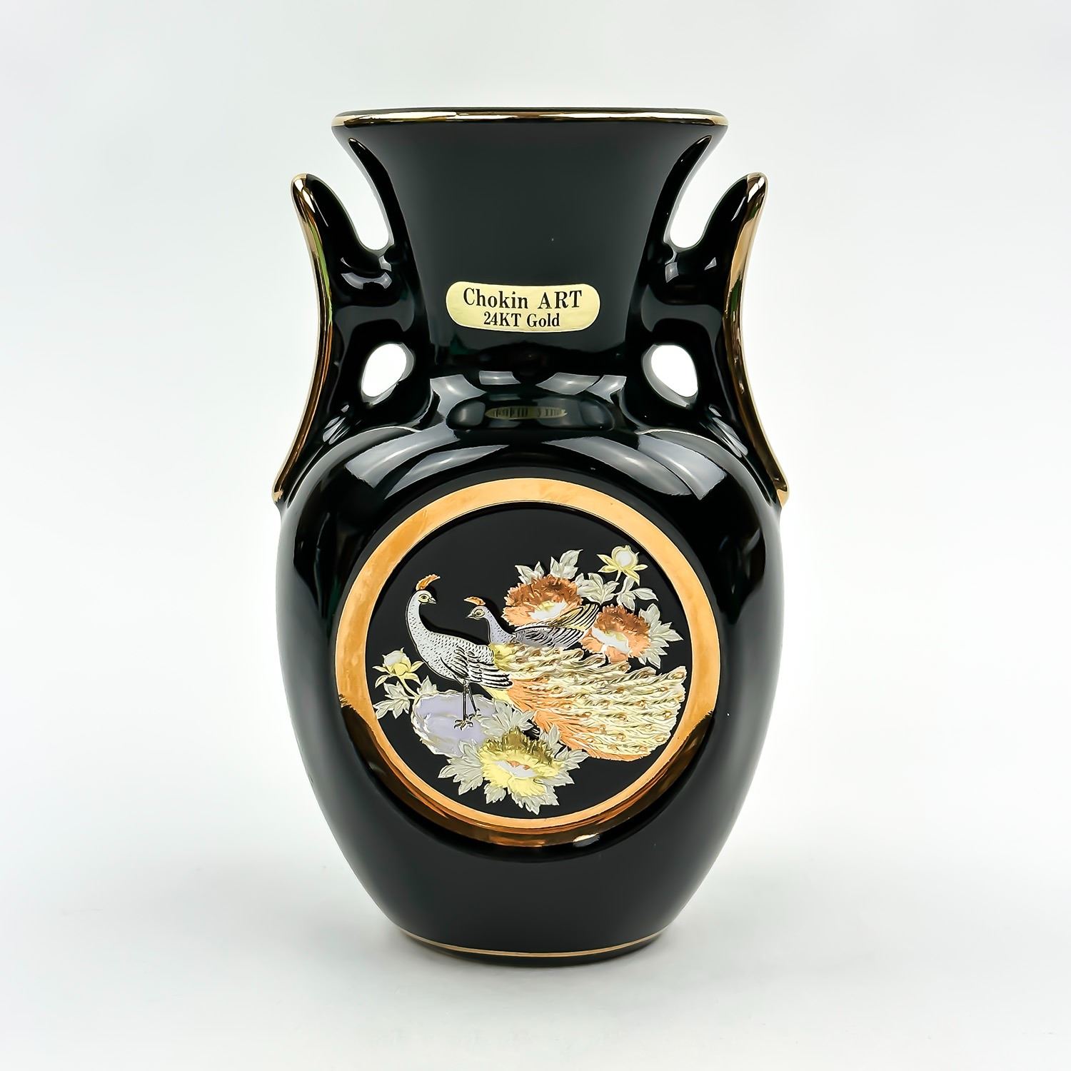 #8101 - SMALL CHOKIN ART VASE - PEACOCK & FLORAL THEME. MEASURES: 5.125” (13 CM) TALL BY 3.25” (8.5 CM) WIDE AND 2.74” (7 CM) DEEP