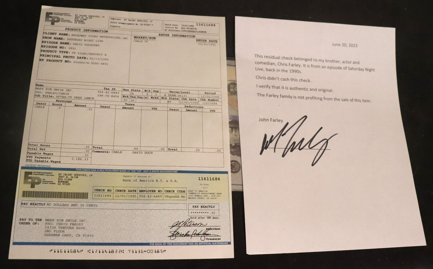 CHRIS FARLEY DAVID DUCHOVNY UNCASHED SATURDAY NIGHT LIVE SNL ROYALTY CHECK W LOA!