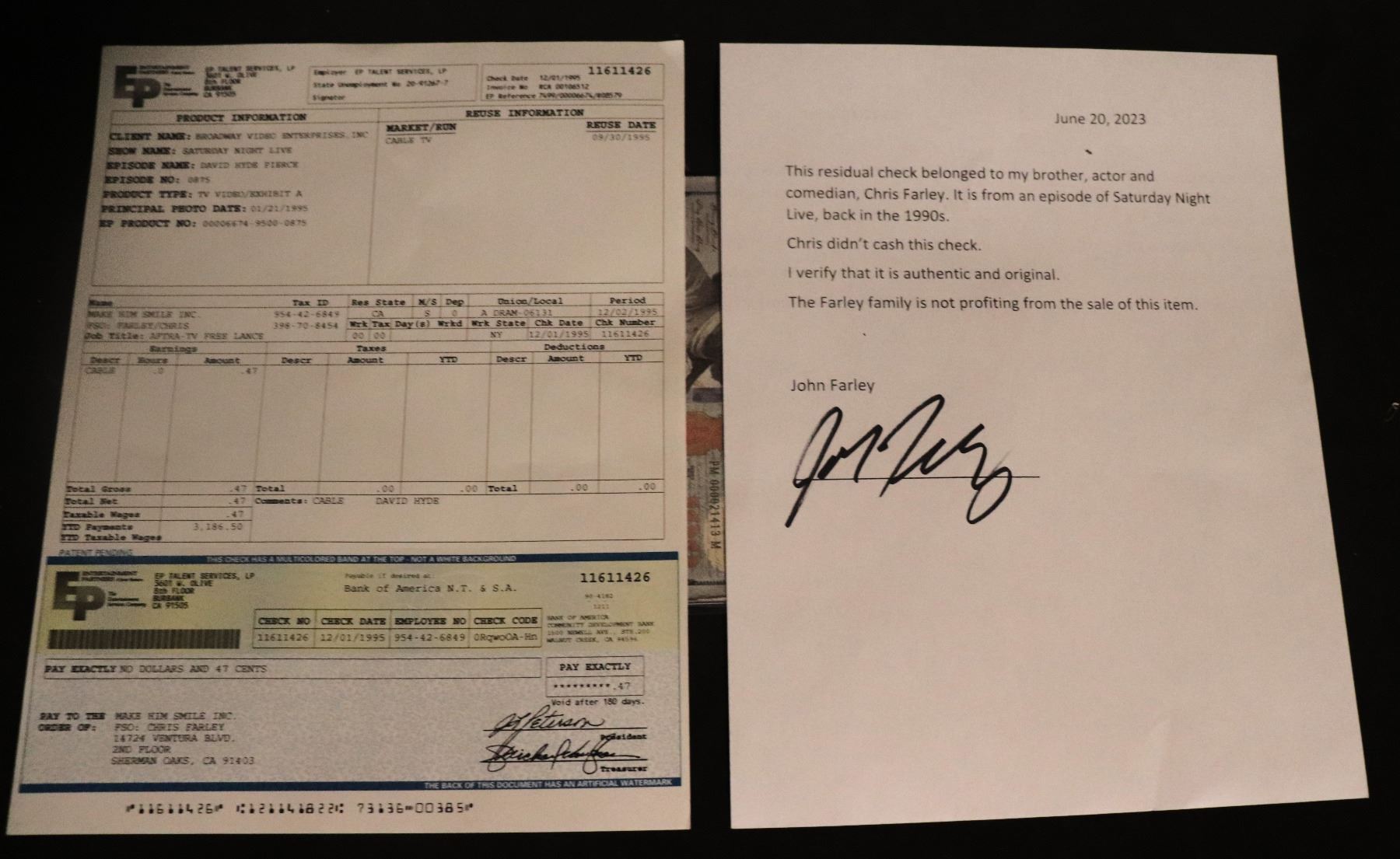 CHRIS FARLEY DAVID HYDE PIERCE UNCASHED SATURDAY NIGHT LIVE SNL ROYALTY CHECK W LOA!