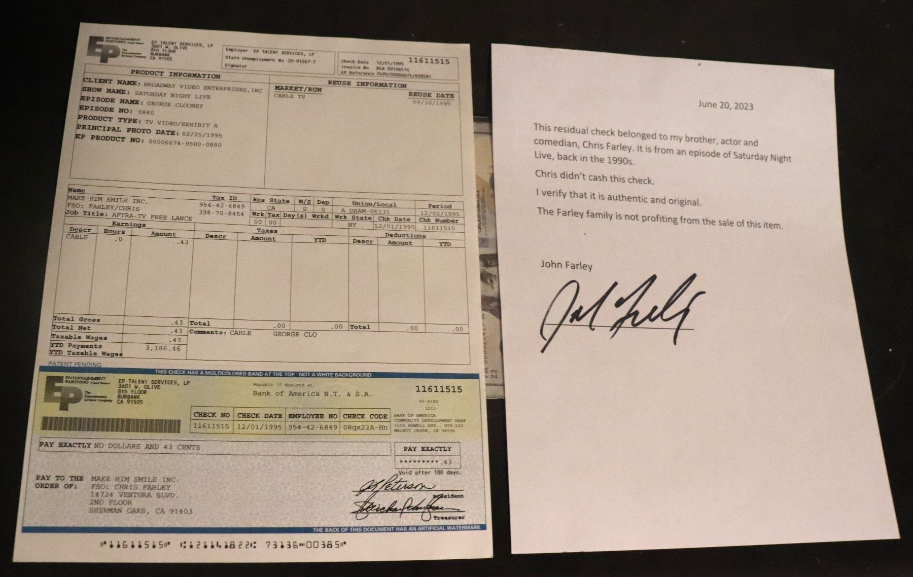 CHRIS FARLEY GEORGE CLOONEY UNCASHED SATURDAY NIGHT LIVE SNL ROYALTY CHECK W LOA!
