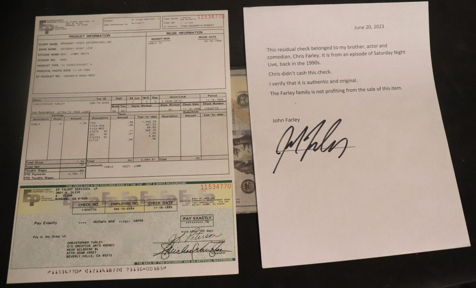 CHRIS FARLEY JIMMY SMITS UNCASHED SATURDAY NIGHT LIVE SNL ROYALTY CHECK W LOA!