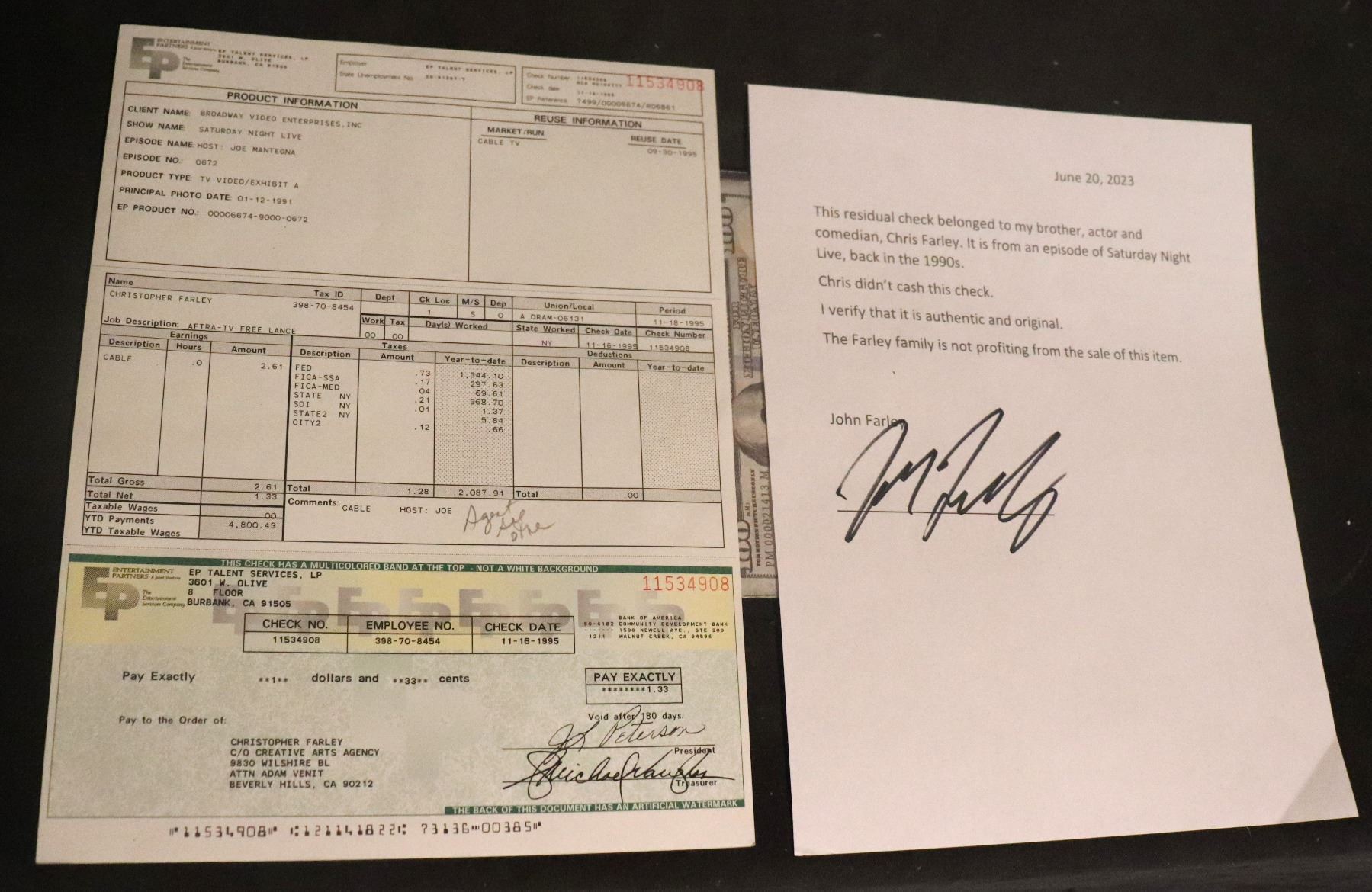 CHRIS FARLEY JOE MANTEGNA SATURDAY NIGHT LIVE SNL ROYALTY CHECK W LOA!