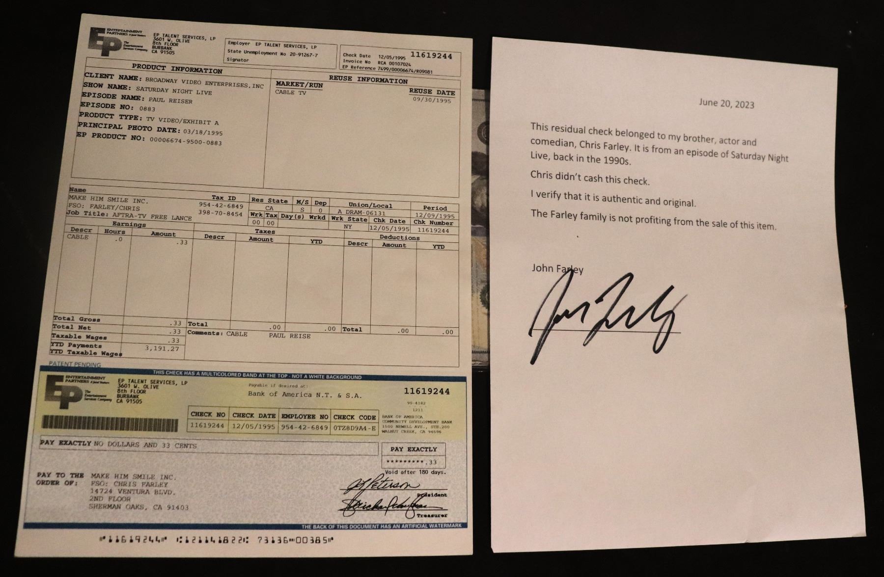 CHRIS FARLEY PAUL REISER UNCASHED SATURDAY NIGHT LIVE SNL ROYALTY CHECK W LOA!