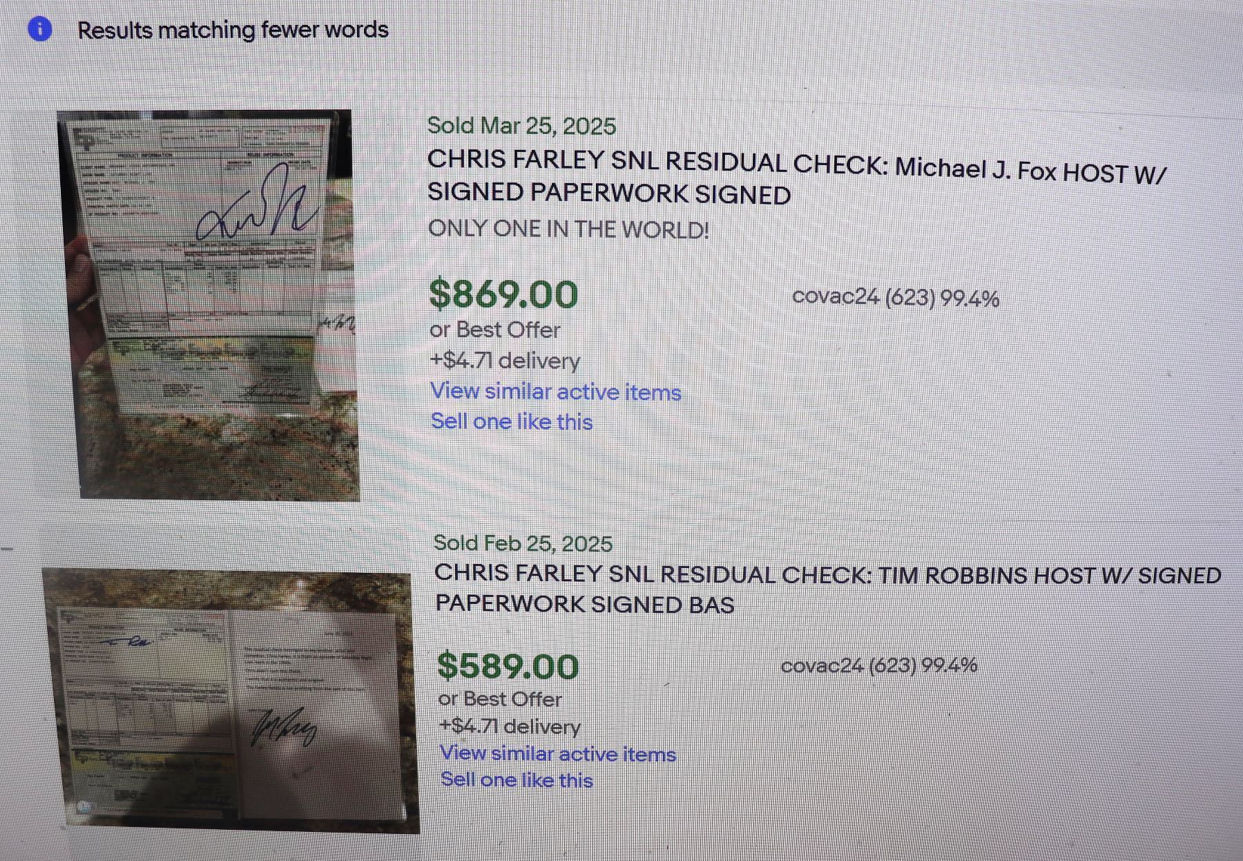 These are all SNL royalty checks Chris Farley left uncashed when he passed away. The title refers to the show host that episode or in a few instances, the specific sketch.