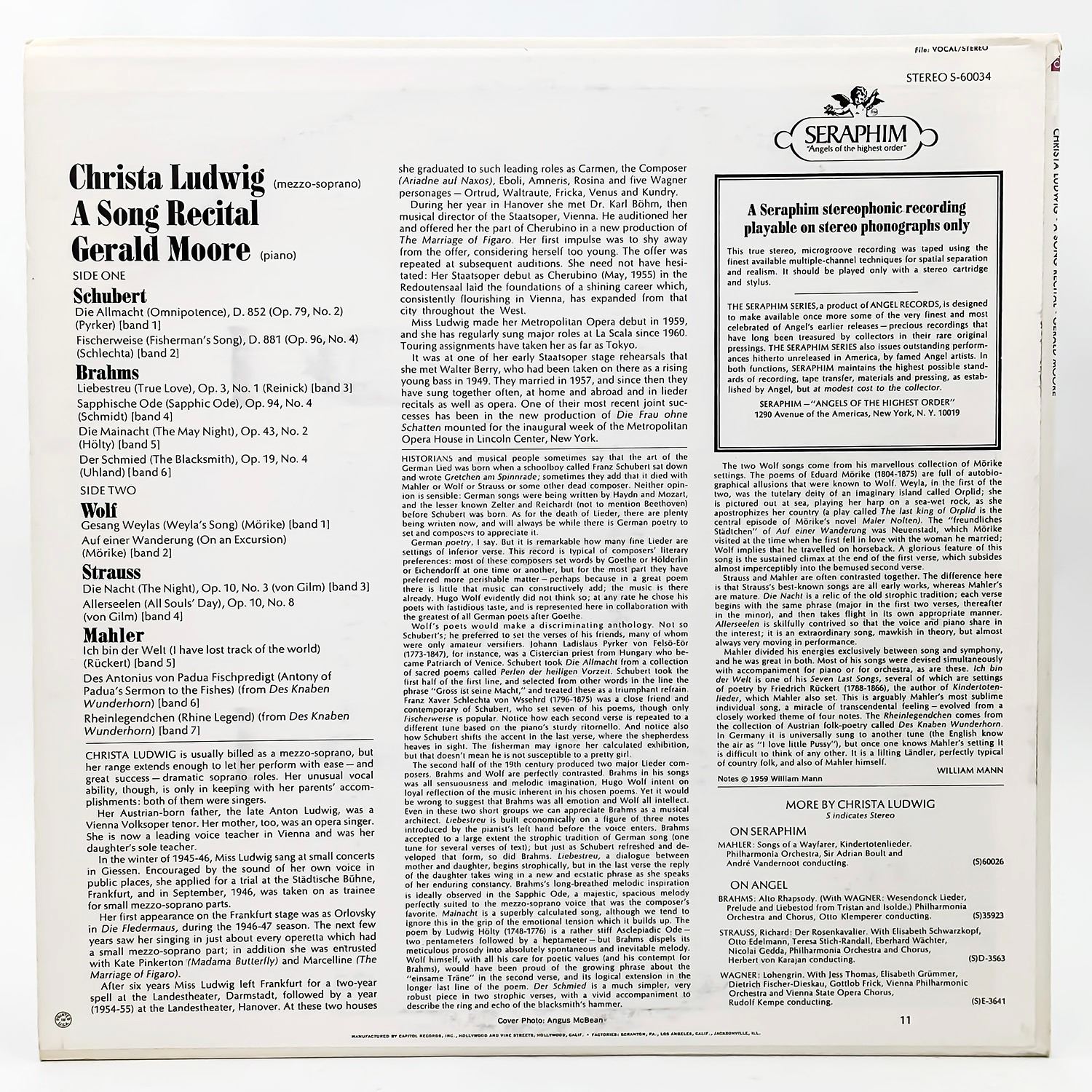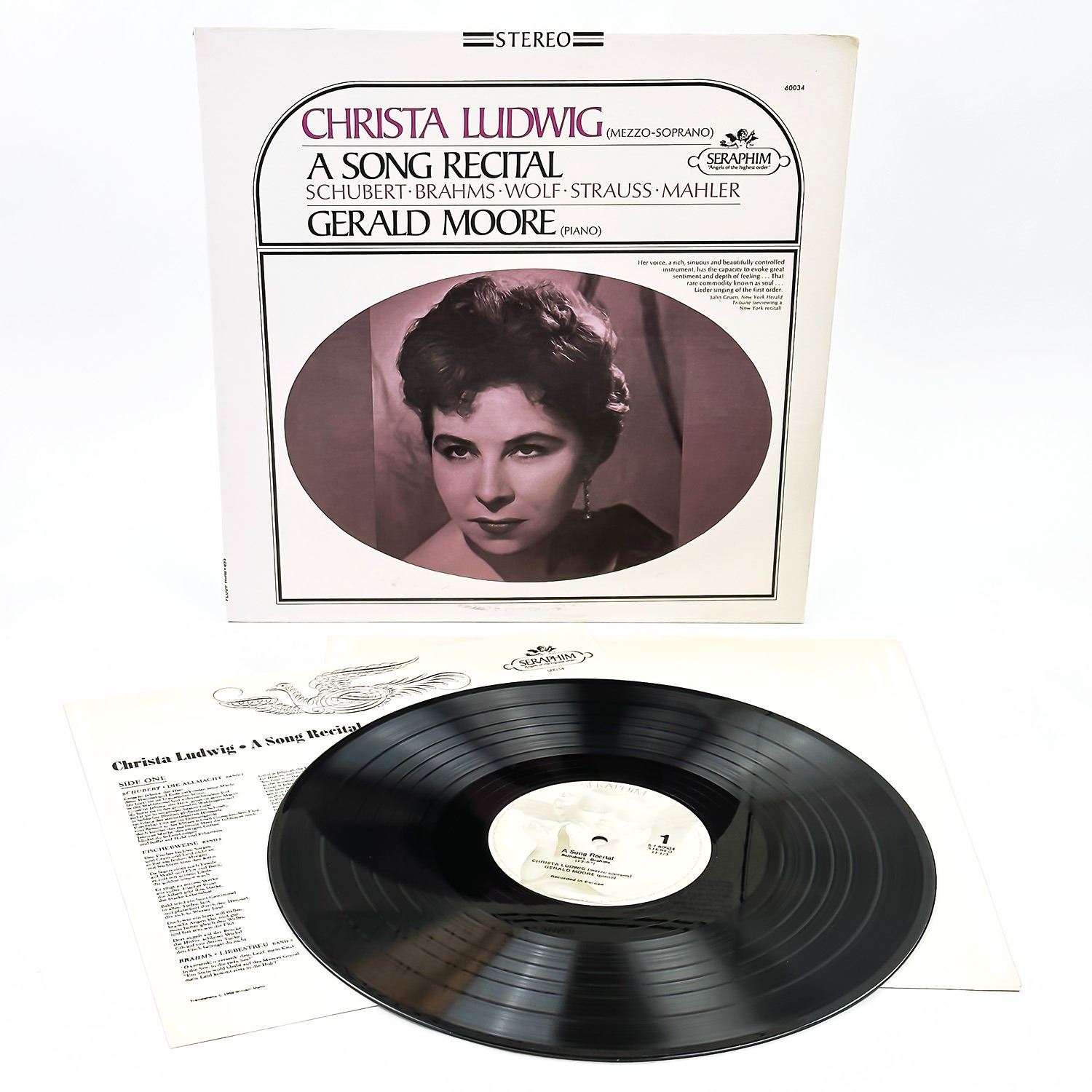 #9557 - FROM PRIVATE COLLECTION OF CLASSICAL/OPERA RECORDS. VINYL LP RECORD ALBUM. CHRISTA LUDWIG - A SONG RECITAL, SCHUBERT, BRAHMS, WOLF, STRAUSS, MAHLER, GERALD MOORE. SERAPHIM RECORDS S-60034