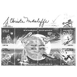 <b>412. CHRISTA MCAULIFFE </b>(1948 - 1986)<b> </b>American astronaut, a civilian teacher from Concord, New Hampshire, killed in the fiery explosion of the Challenger space shuttle. Rare, bold black ink signature "<i>S. Christa McAuliffe</i>" written in the white gutter of a block of eight postage stamps honoring the space shuttle program. Fine condition.<b> $500-700</b>