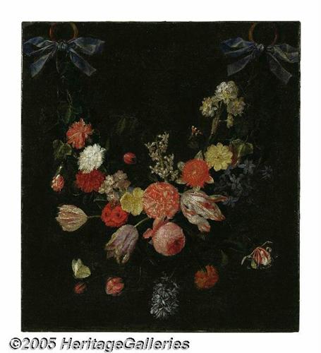 <B>CHRISTIAAN LUYCKS (Belgian 1623 - 1653)</B></I><BR>A Garland of Flowers<BR>Oil on canvas<BR>22.5in. x 20.25in. <BR>The painting is accompanied by a letter from Dr. Samuel Segal of Still Life Studies, Amsterdam, dated December 2, 2003; painting number 30062; and an extensive condition report from Dr. Nicholas Eastaugh of UCL Painting Analysis, London accompanies this work<BR>Provenance: private collection, Great Britain; [Bonham's July 8, 1998, lot 54 as Circle of Daniel Seghers]; private collection, Middlesex, England<BR>This painting was formerly attributed to Daniel Seghers (Flemish 1590-1661), but after extensive research by still life specialist, Dr. Samuel Segal of Still Life Studies, Amsterdam, the painting is now attributed to Christian Luycks.<BR><BR>Condition Report: Unlined original canvas, surface has been abraded, details of insects are missing, significant detailed inpainting in flowers and background.<BR><BR>Brian Roughton: No problem with authenticity with letter. Condition as noted.<BR>