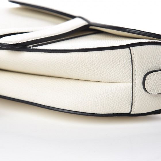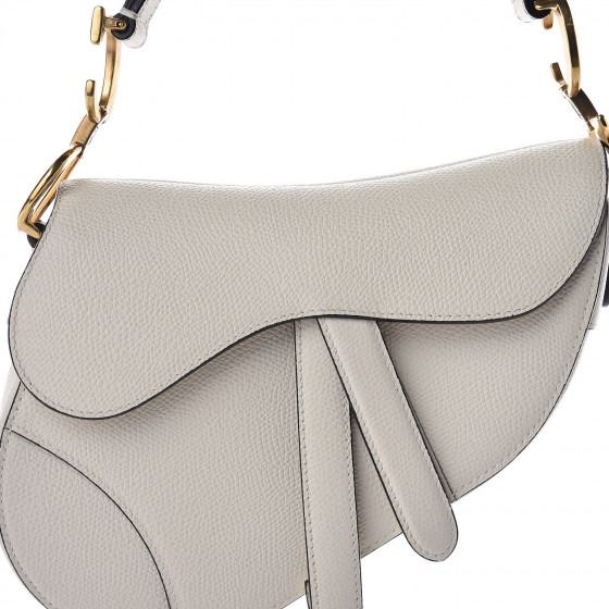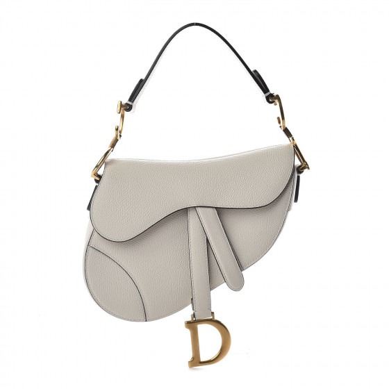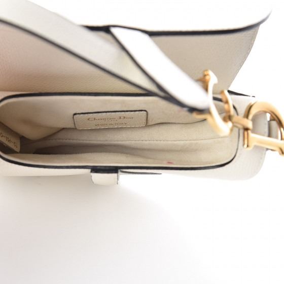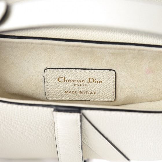 White saddle-shaped handbag is crafted of grained calfskin leather and features a matching leather strap, secured with aged gold CD logo anchors. The front flap has an aged gold CD initial logo, and opens to a white microfiber interior.
