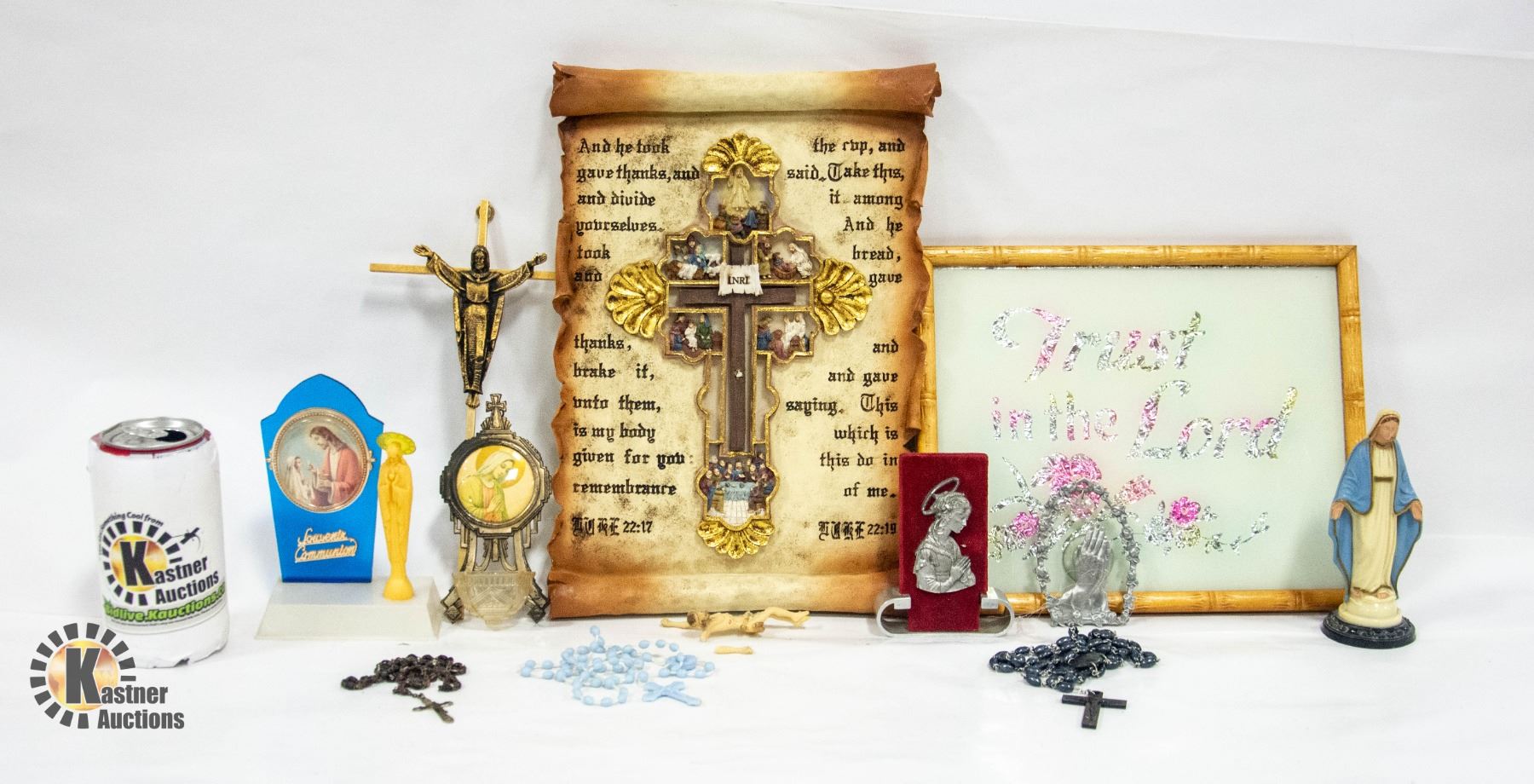 CHRISTIAN ITEMS STONE SCROLL, PICTURE, ROSARYS