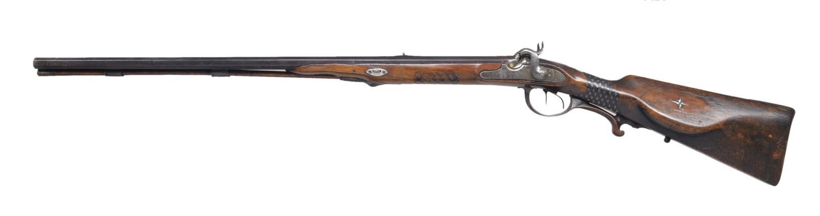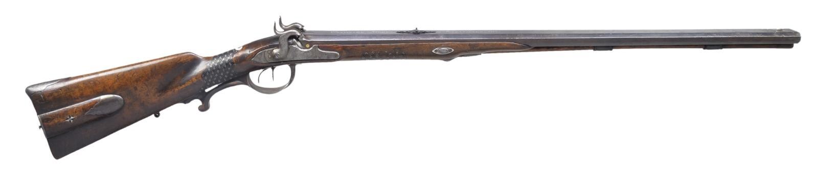 Cal. about 58. S# 3235. Bbls. 28 1/4" w/ oct. profile having rib creating a single surfaced top flat. Flat has silver inlaid marking "CHRISTIAN KORBER IN INGELFINGEN 1817". Silver blade front sight w/ V notch rear sight. Right bore is rifled, left bore is smooth (about 20 Ga.). Unmarked iron locks & hammers w/ highlight engraving. Wedge fastened straight hand cheekpiece walnut stock. Forearm & wrist of stock has french style skip line checkering w/ studded highlights & uncheckered diamonds. Right side of stock has patch box w/ iron trimmed walnut cover. Patchbox cover & cheekpiece have 4 point mother of pearl inlays. Wide iron trigger guard w/ carved walnut finger rest. Iron buttplate, faceted thimble & 2 faceted pipes hold horn tipped ramrod. Toeline is fitted w/ swivel base. Wrist has German silver oval presentation plate. CONDITION: bbls. have faded browned finish showing scattered spots of pitting. Locks have faded to gray showing pitting. Stock has worn appearance w/ numerous dents & handling marks having added wood repaired chips above forward portions of both locks. Dark lightly pitted bores. (01-18406/DS). ANTIQUE. $700-1,000.