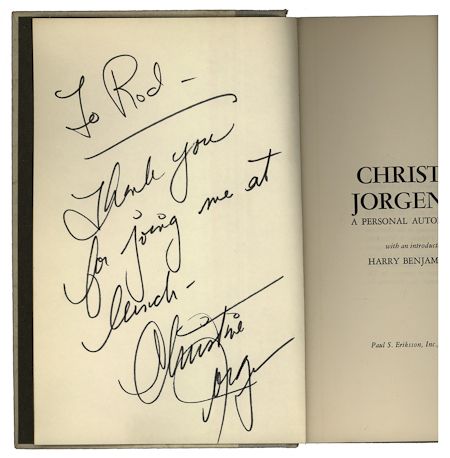 (1926 - 1989) Controversial recipient of the first sex-change operation, from man to woman. Her volume Christine Jorgensen: A Personal Autobiography (New York: Paul Erickson, 1967), hardbound, 332pp., very boldly inscribed on the page opposite half title: "To Rod Thank you for joining me at Lunch Christine Jorgensen". Dustjacket a bit worn, else very good.