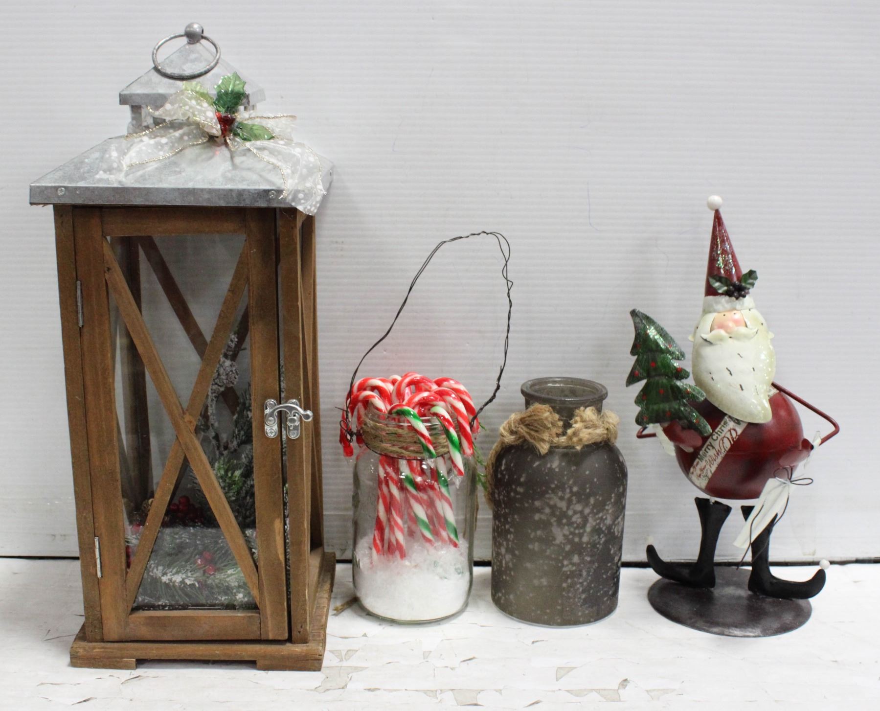 INCLUDES WOOD LANTERN, BATTERY OPERATED FROSTED GLASS LANTERN, METAL SANTA FIGURE, CANDY CANE JAR **ALL ITEMS MUST BE REMOVED BY 5PM SATURDAY, NOVEMBER 30TH 2024. ALL REMAINING ITEMS WILL BE SUBJECT TO A $6.00 PER DAY STORAGE CHARGE. ANY ITEMS REMAINING AFTER MONDAY, DECEMBER 16TH 2024 WILL BE CONSIDERED FORFEITED. NO REFUNDS WILL BE ISSUED FOR FORFEITED ITEMS. TO SCHEDULE A PICK UP APPOINTMENT CLICK HERE