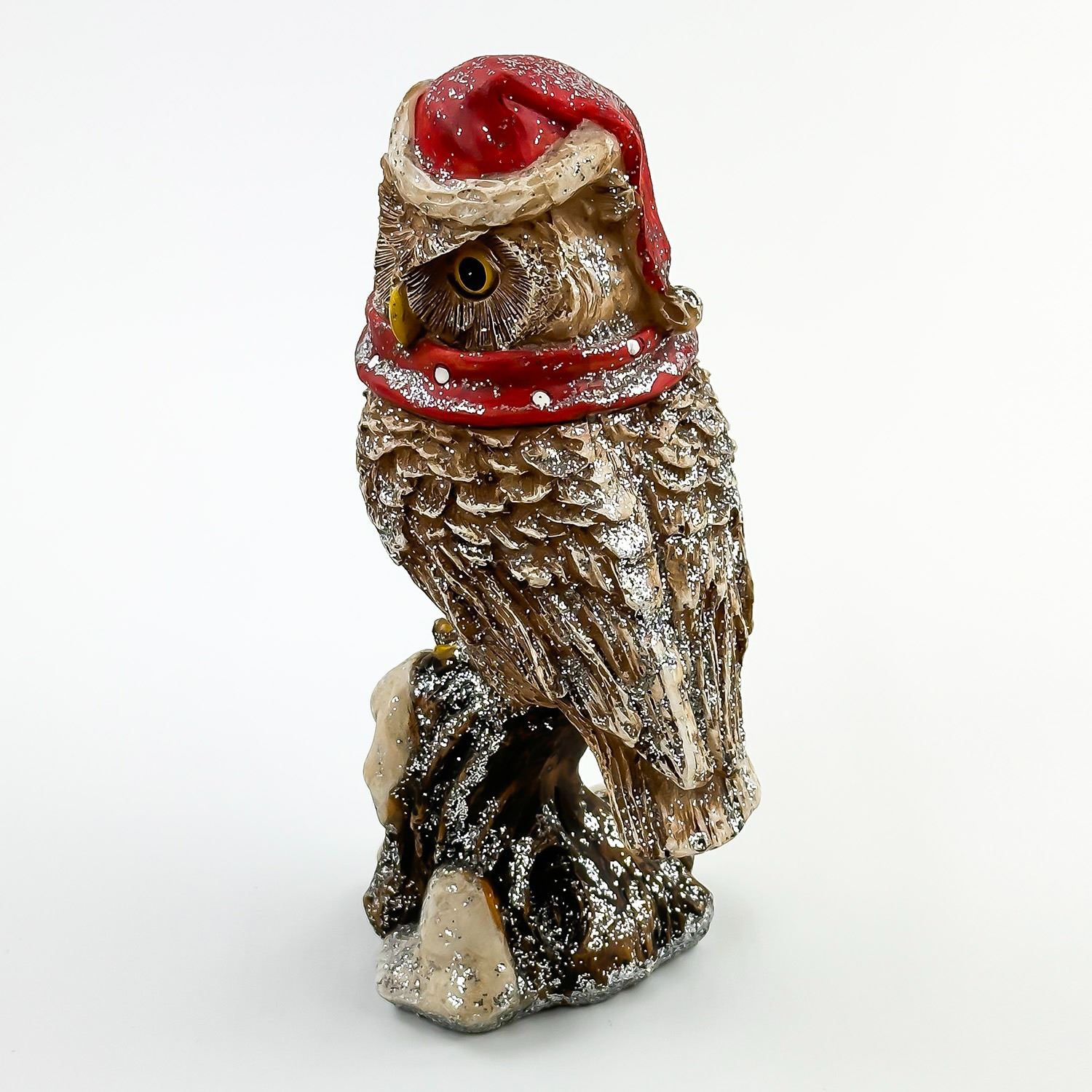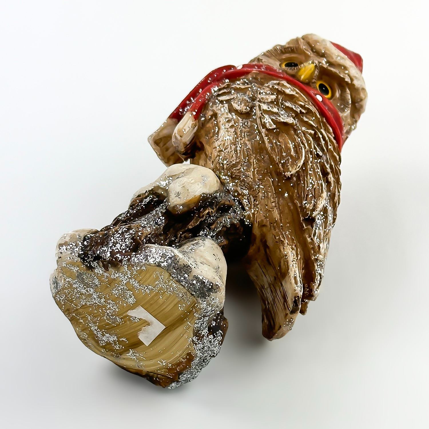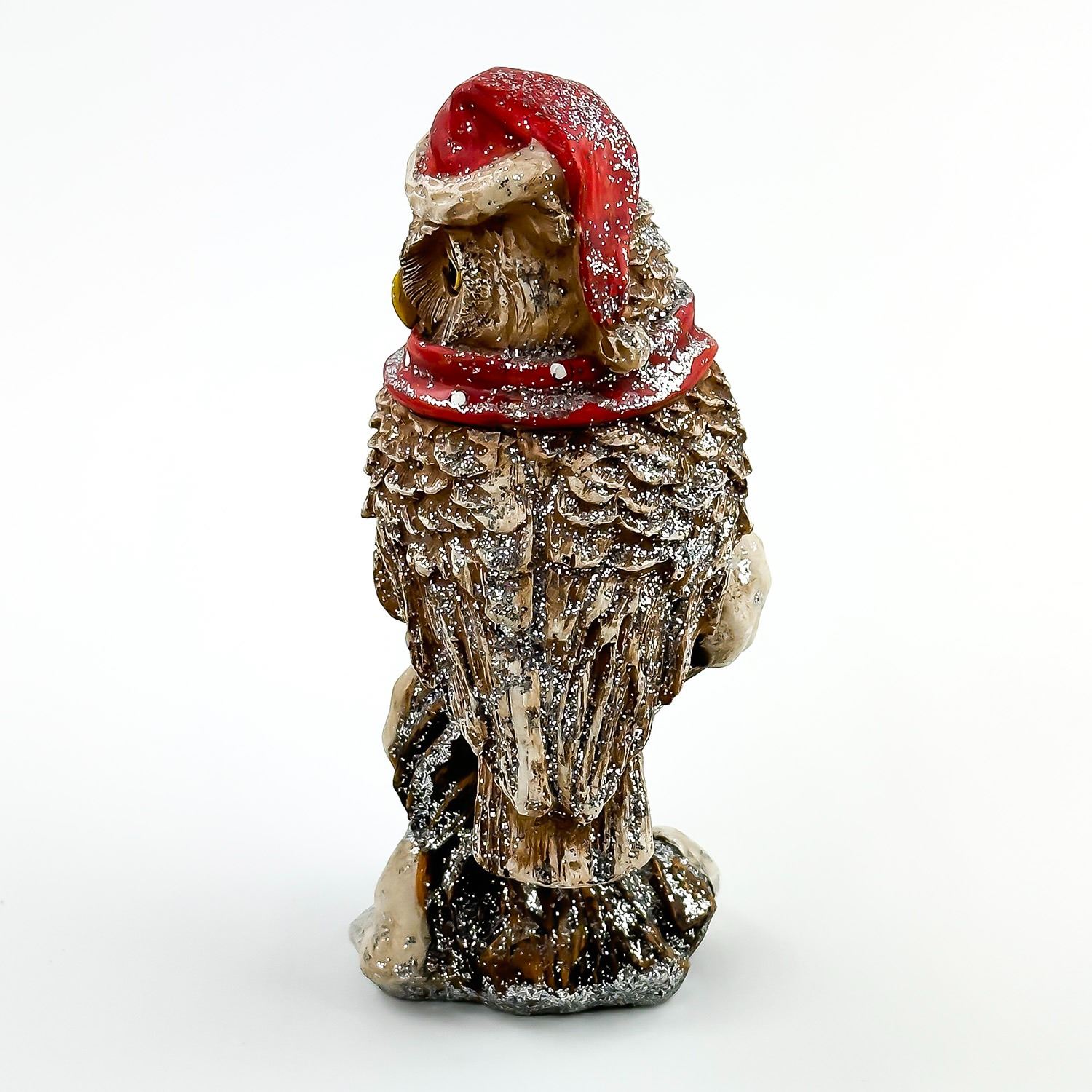 #8007 - UNMARKED OWL SCULPTURE. APPEARS TO BE MADE OF A RESIN TYPE OF MATERIAL - THE SILVER IS GLITTER. MEASURES: 7” (18 CM) HIGH BY 3.5” (9 CM) WIDE AND 3”(8 CM) DEEP