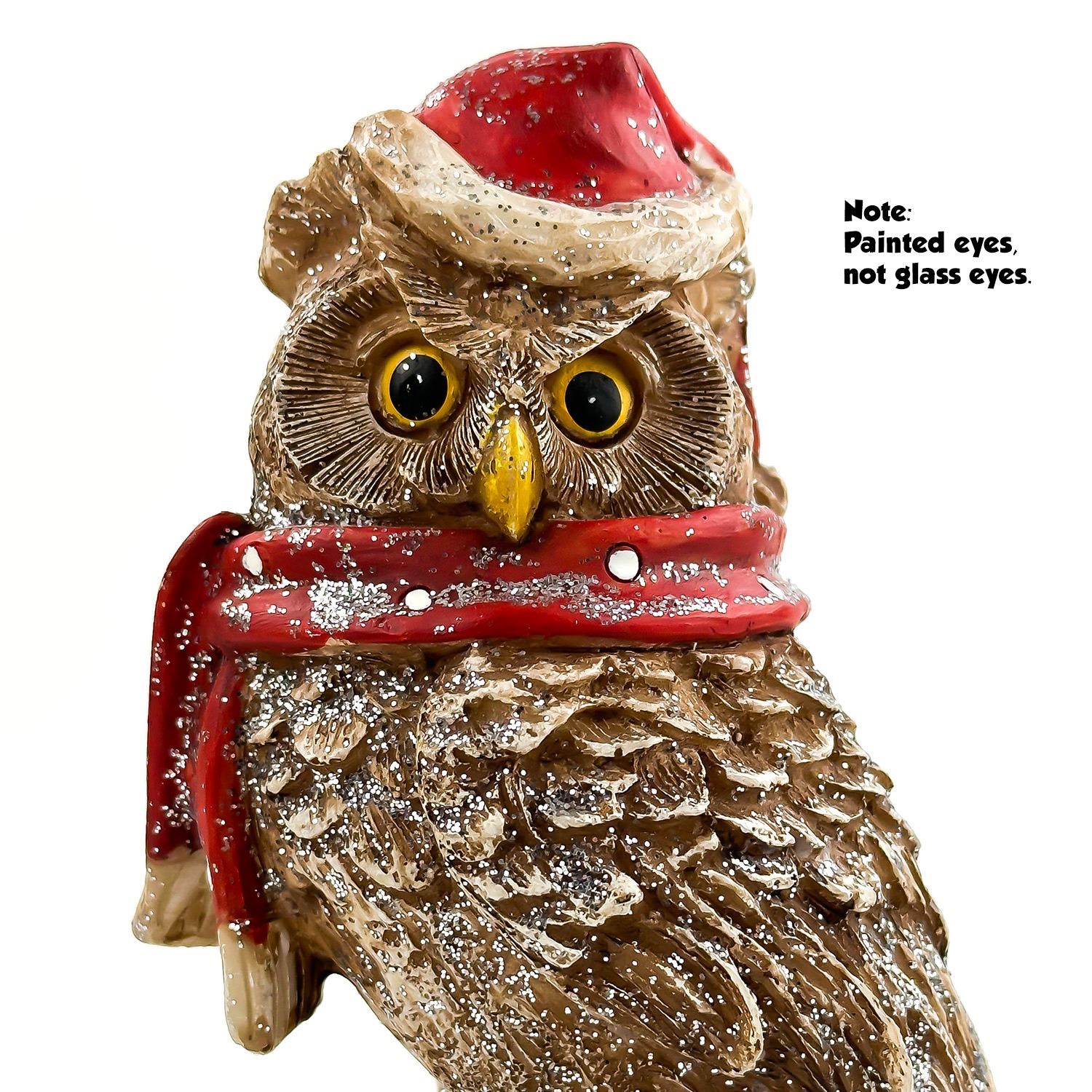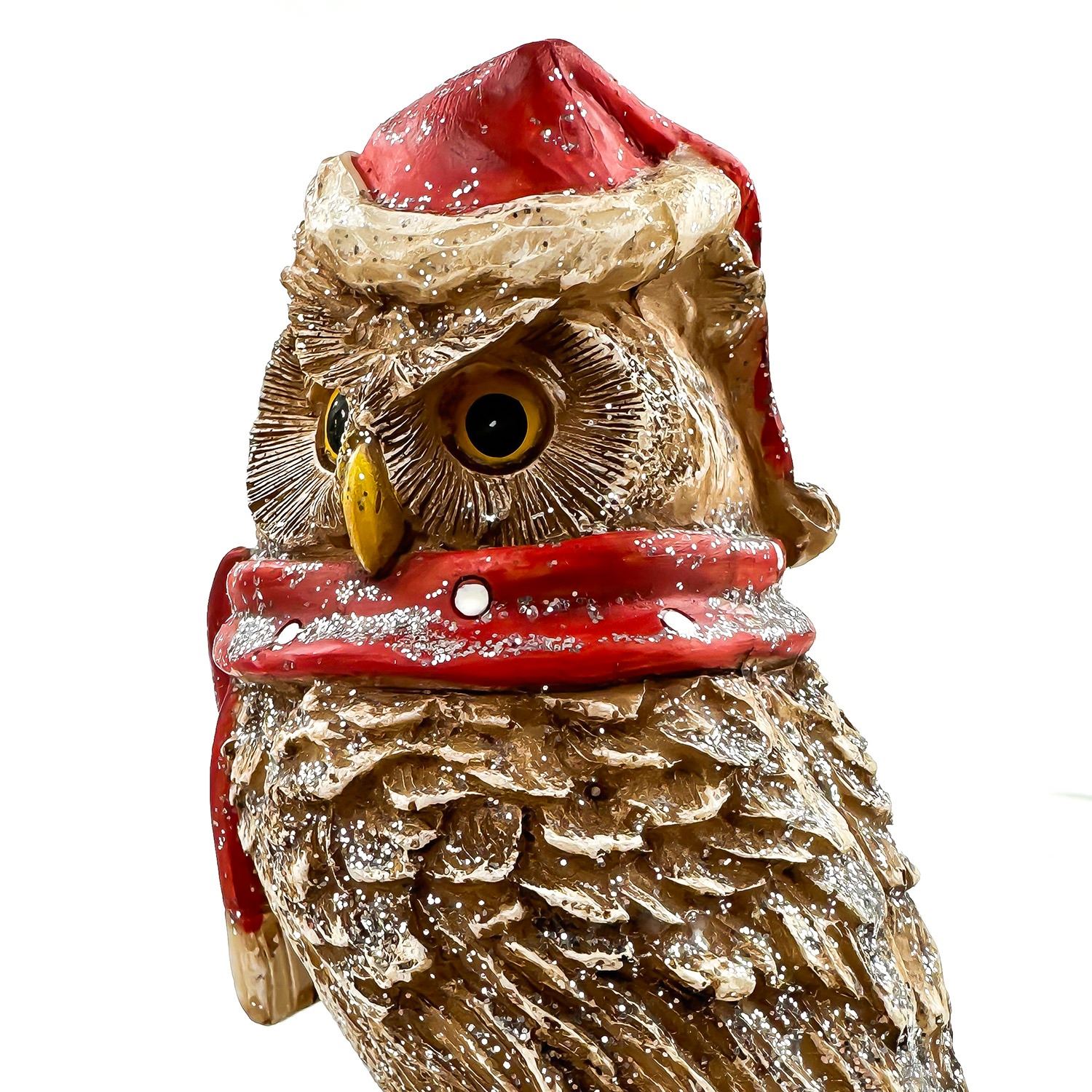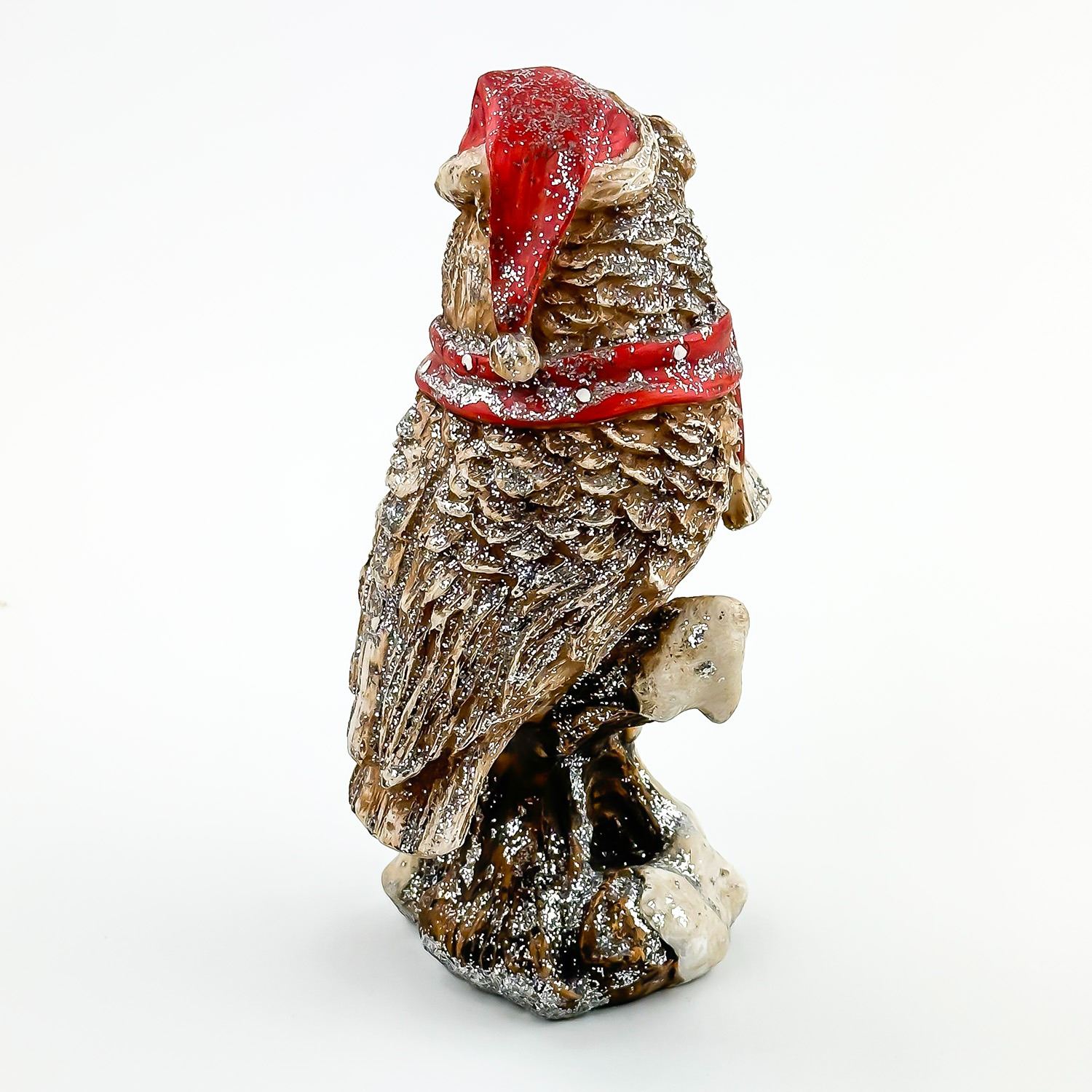 #8007 - UNMARKED OWL SCULPTURE. APPEARS TO BE MADE OF A RESIN TYPE OF MATERIAL - THE SILVER IS GLITTER. MEASURES: 7” (18 CM) HIGH BY 3.5” (9 CM) WIDE AND 3”(8 CM) DEEP