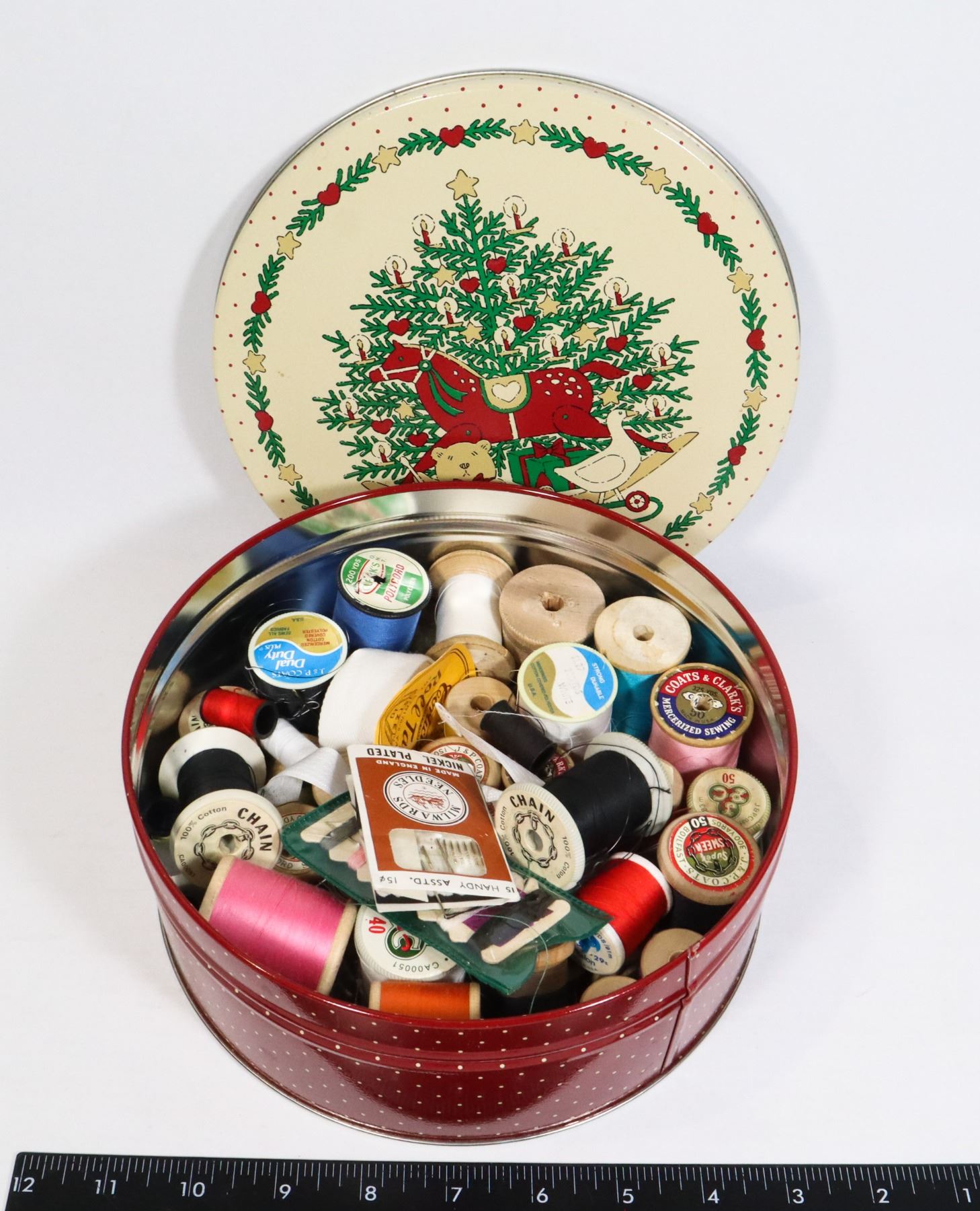 CHRISTMAS TIN FULL OF VINTAGE SEWING THREAD