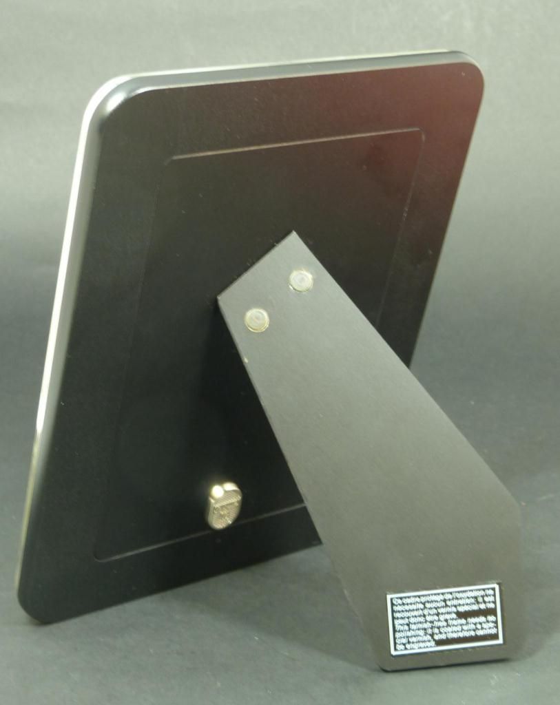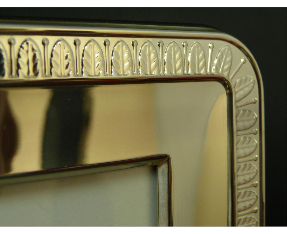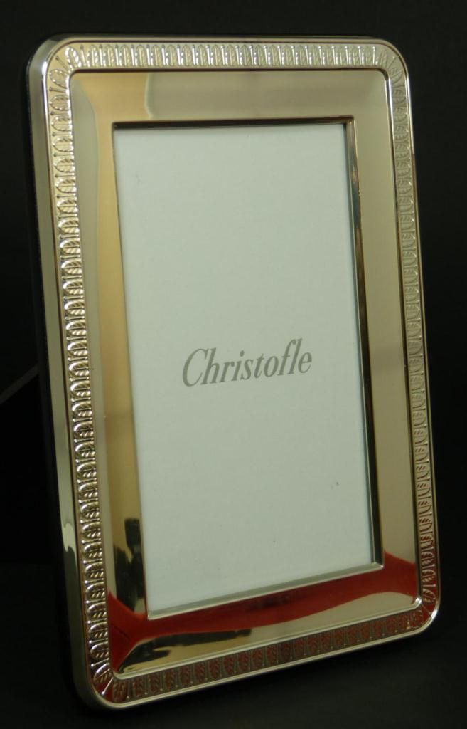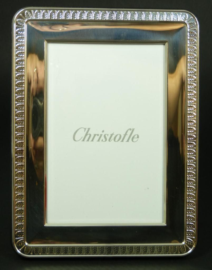 A Christofle French sterling silver picture frame with leaf border design. Includes original presentation box. Measures 8" height x 6" width (20.3cm x 15.2cm). Holds image approx. 5 3/4" height x 3 3/4" width (14.6cm x 9.5cm). Total weight of 497 grams with box.